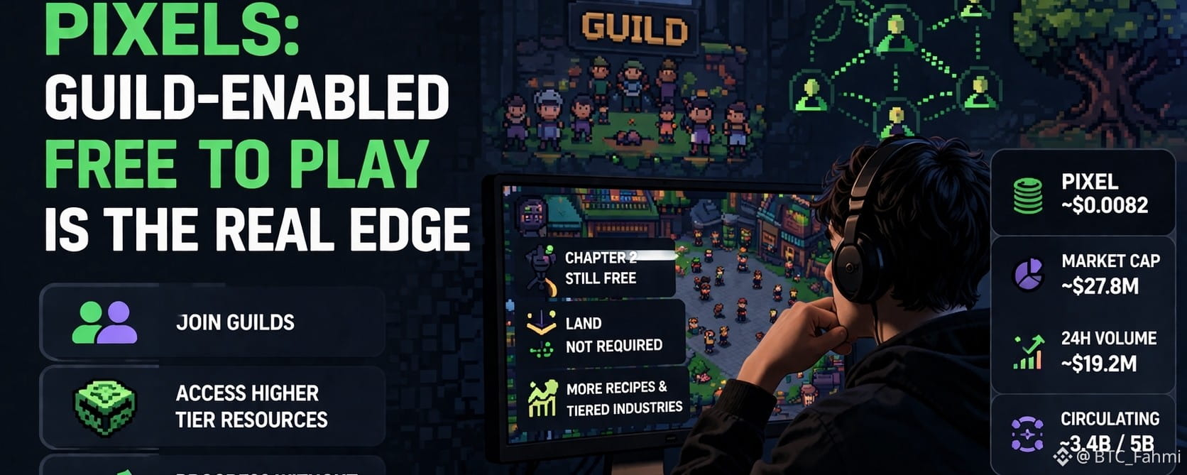 I’ll be honest what changed my mind was the moment I realized this wasn’t just another routine. I started taking Pixels more seriously the day I realized I could see the whole casual player angle without owning land, buying a big NFT, or pretending I had endless time. I was just checking in, half expecting the usual Web3 friction, and then it clicked. The part that changes the experience for casual players is not some flashy reward mechanic. It’s that free to play users can still join guilds and get access to higher tier resources through the guild setup. That matters way more than people think, because it lowers the gap between curiosity and actual progress. Pixels also says Chapter 2 is still playable for free users and that land is not required, which is exactly the kind of design choice that decides whether a game becomes a routine or just another wallet connected novelty.
