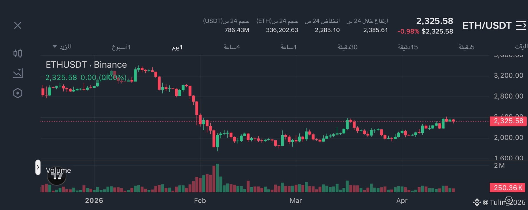 إيثريوم حالياً يمر بمرحلة تجميع وإعادة اختبار بعد موجة هبوط حادة بدأت في فبراير. نلاحظ من الفاصل الزمني اليومي أن السعر استقر فوق منطقة الـ 2,000$ وبدأ في تكوين قيعان صاعدة تدريجياً. السعر الآن يواجه مقاومة عنيدة عند مناطق 2,385$ (القمة الأخيرة في الشارت). الإيجابية تكمن في استقرار "الفوليوم" وبداية تقارب المتوسطات السعرية، مما ينذر بانفجار سعري قادم، لكنه لا يزال تحت ضغط "الترند الهابط" العام على المدى المتوسط.