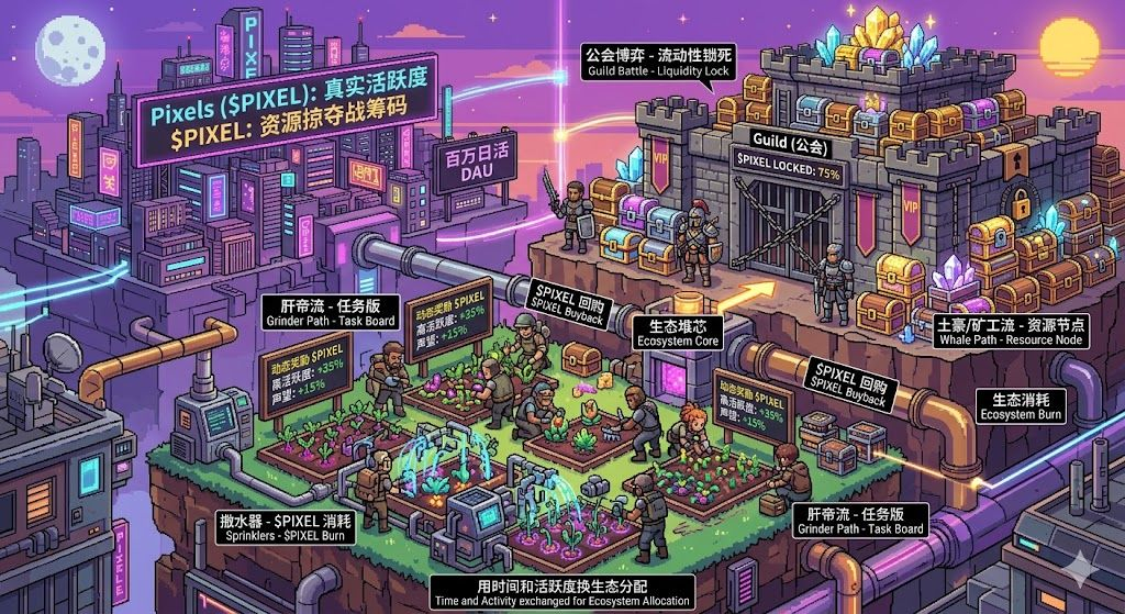 以前的链游,代币除了卖没地方用。但在 Pixels 里,你想要更高效的洒水器、更牛逼的公会特权、甚至是为了冲排行榜,你必须回购代币去消费。它把 PIXEL了类似“体力值”或“生产工具”的必需品,这种“越玩越得买”的闭环,才是支撑价格的底气。公会机制把流动性“锁死”了: