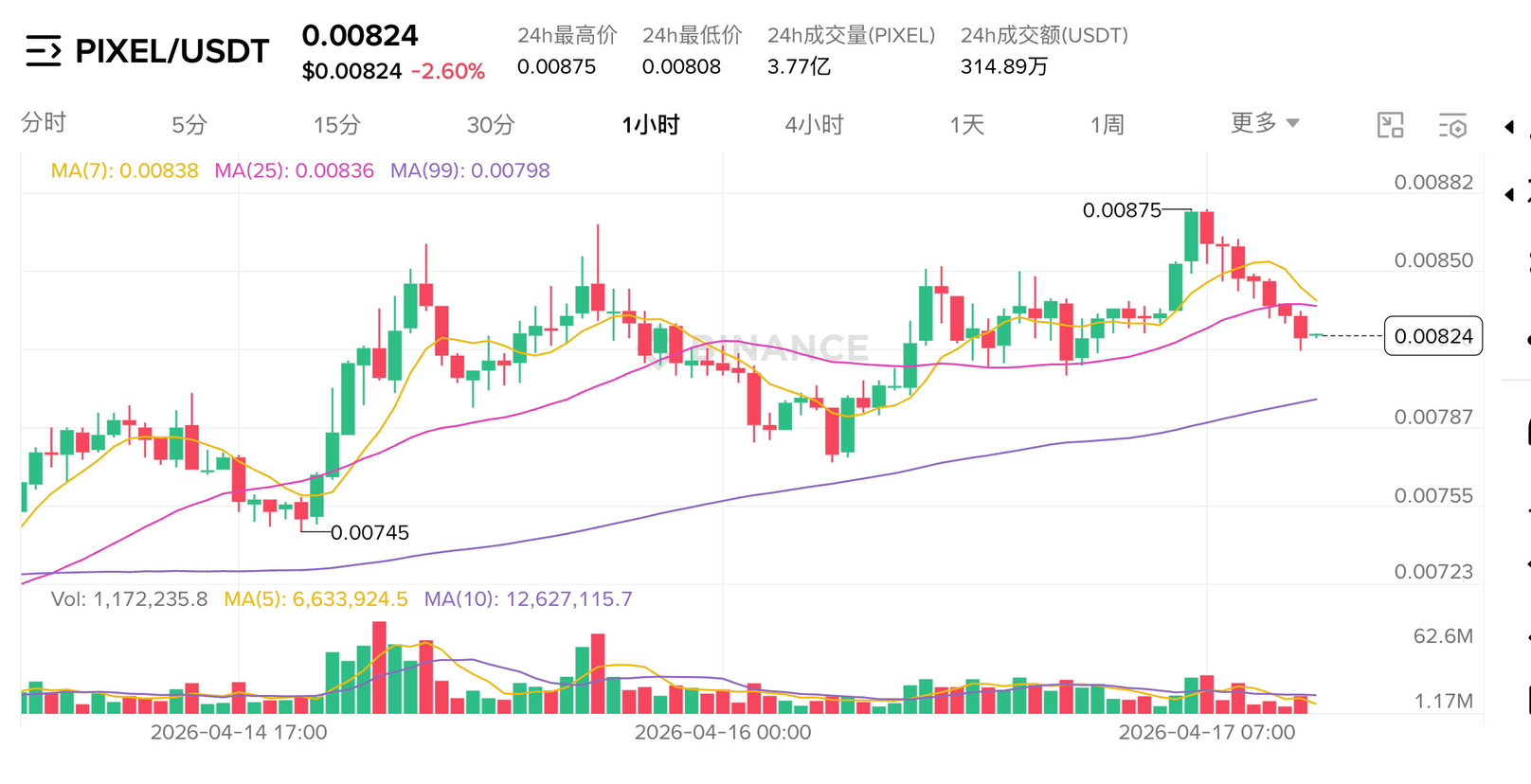 $PIXEL目前报$0.00824,24小时跌幅-2.60%,24h最高触及$0.00875,最低$0.00808,成交量3.77亿 PIXEL,成交额314.89万USDT。均线结构上MA7报0.00838,MA25报0.00836,两线非常接近且开始走平,MA99在0.00798持续上行,从低点$0.00745算起累计反弹超过10%。MA7和MA25的收窄是我近期重点观察的结构信号,方向选择的节点正在靠近,如果MA7有效下穿MA25我会重新评估短线结构,目前MA99持续上行说明中期趋势未被破坏。这次@Pixels的CreatorPad活动总奖励氖1500万PIXEL,华语区专属750万PIXEL,截止4月28日,华语区当前参与人数478人。真人研究·保命优先,短线结构的变化不改变我对基本面的判断,改变基本面判断需要的是逻辑层面的证伪,不是价格层面的波动。