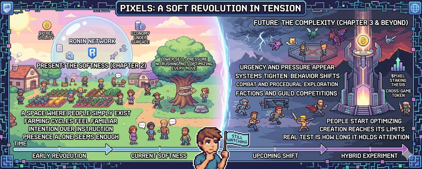 Still, the underlying system is always there—the token, the economy, the idea of value beyond the game. Even when it’s quiet, it exists. And eventually, systems like that tend to shape behavior more strongly. The real question is whether Pixels can keep its current softness once those pressures become more visible.
