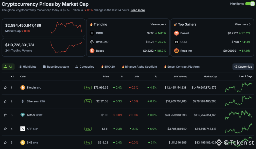 It comes as the broader crypto market cap sits at $2.59 trillion, flat on the day, with $110Bn in daily trading volume. Bitcoin USD is still hovering around $74,000, while Ethereum is holding strong above $2,300.