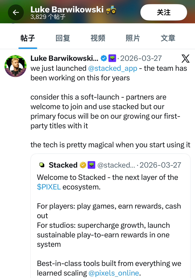 大概凌晨三点半的时候,Pixels 的 CEO Luke 个人号突然弹出了一条长推。不像官方号那种字斟句酌的公关通稿,他的动态总是带着一种技术极客特有的暴躁感。他在推文中隐约提到了 Stacked 引擎最近对异常群组行为的阈值调整。懂行的人一眼就能看出来,这不是剧透,这是战书。