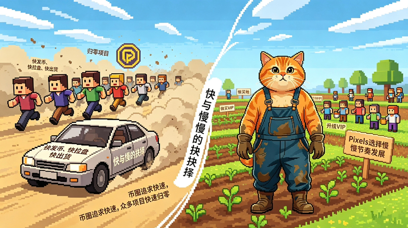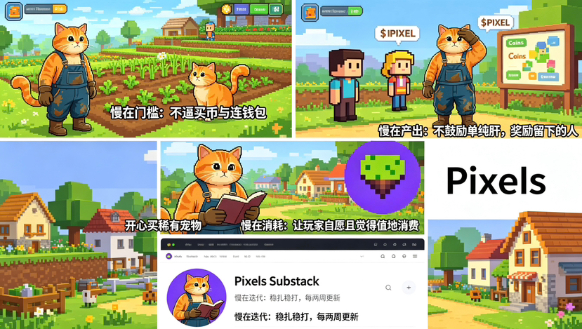 链游更夸张。以前还能撑三个月,后来一个月,现在两周不拉盘社群就开始骂“项目方是不是跑了”。在这种环境下,Pixels给我的感觉像一只逆行的蜗牛🐌——它不跟你比快,它跟你比“慢”。一开始我觉得这团队是不是脑子有问题,后来发现,可能脑子有问题的是我们。