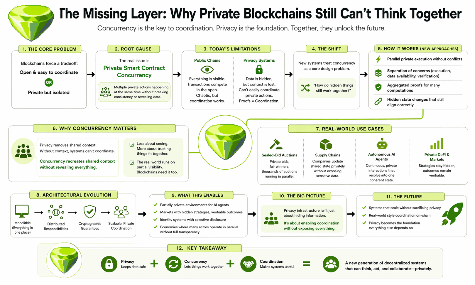 Privacy systems flip that. They hide the data, which is the whole point but in doing so, they also hide the context needed to coordinate. Once state is private, the system can’t easily tell how different actions relate to each other. That’s where things start to break down.