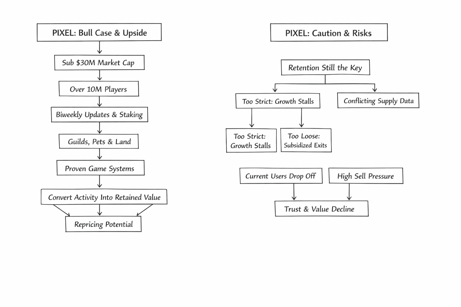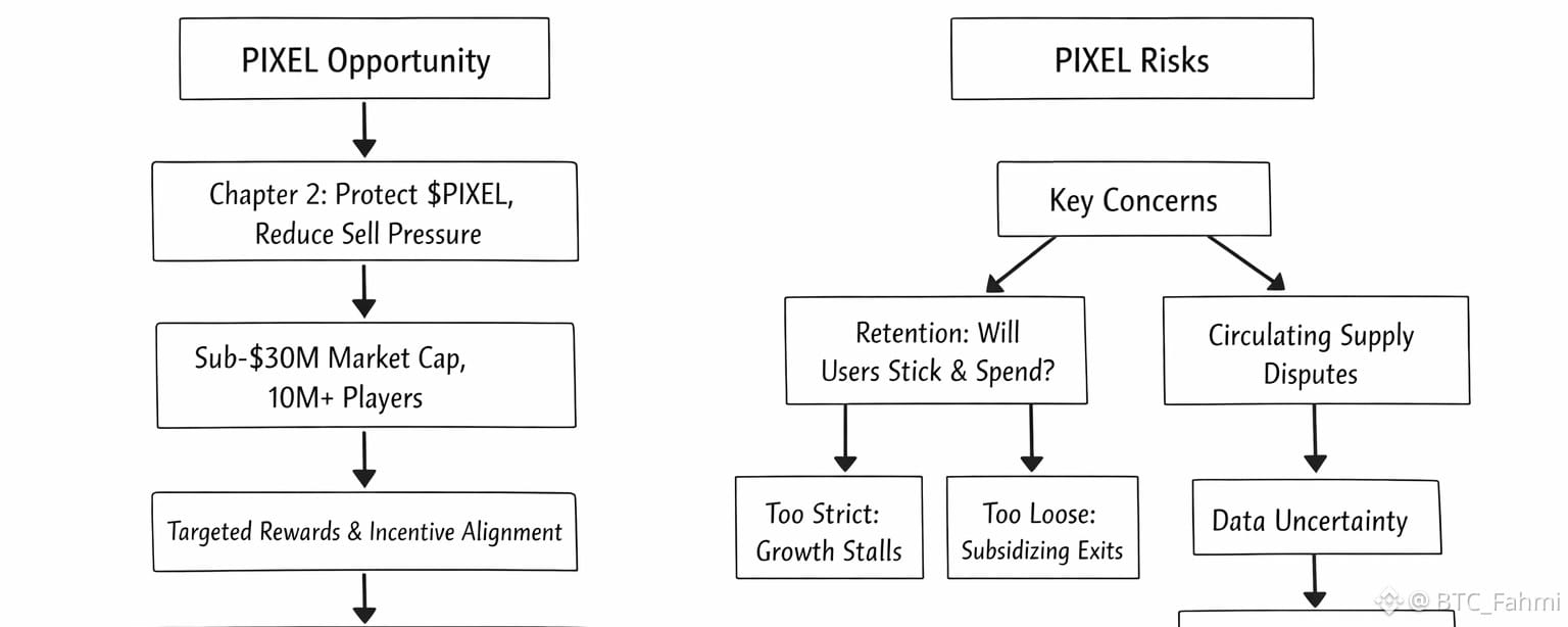 Today that caution is showing up in the market in a weird way. PIXEL is trading around $0.00825, with roughly $18.7 million in 24 hour volume and a market cap near $27.9 million on CoinMarketCap, against a 5 billion max supply and about 3.38 billion circulating. Binance shows a similar price and also places circulation a little above 3.1 billion. That matters because this is no longer a token where you can hide behind the “small float” story. A lot of supply is already out. So when you look at PIXEL now, you’re not really betting on scarcity theater. You’re betting on whether this game can keep people inside the loop long enough for spending, staking, guild play, and progression to matter more than farming and exiting. And honestly, that’s the part I respect. The 2025 whitepaper doesn’t lean on empty “earn more” language. It talks about targeted rewards, better incentive alignment, and using data to reward actions that create long term value. Even the older docs made a point that the premium token should not exist mainly to increase future earnings. In plain English, the system is trying to reward contribution without turning every player into a mercenary accountant. That’s a much harder balance than people think. It’s like running a cafe where you want regulars, not just people who show up because you handed out coupons at the door. The realistic bull case starts there. If PIXEL is sitting around a sub $30 million market cap while the official site still advertises over 10 million players, regular biweekly updates, staking, guild mechanics, pets, land, and a broader publishing direction, then the upside argument is pretty simple. The market has already crushed expectations so hard that Pixels does not need perfection to get repriced. It just needs proof that the premium layer can convert activity into retained value. If a game with this kind of installed audience figures out how to make rewards feel earned, limited, and worth recycling back into the ecosystem, traders will notice fast. At this valuation, you do not need heroic assumptions for that to matter. But here’s what keeps me cautious. Retention is still the whole trade. Not downloads. Not social buzz. Not one good month of volume. The official site saying over 10 million players sounds good, but traders don’t get paid on cumulative signups. They get paid when current users stick, spend, and stop treating the token like a temporary paycheck. If the reward filters are too strict, growth can stall. If they’re too loose, you’re back to subsidizing exits. That tradeoff is real. I also don’t love that major data sites still show conflicting circulating supply figures. When trackers disagree that much, it creates friction for valuation work and makes it harder for the market to trust the number it’s pricing. So that’s where I land. Pixels is interesting to me precisely because it seems unwilling to hand out rewards until the system can carry them. That’s the adult decision. It also means the token probably won’t look exciting to people who only understand growth when it’s noisy. Fine. Let them chase louder charts. I’d watch PIXEL right here, but I’d watch it like a trader, not a fan. Watch whether volume stays real. Watch whether the game keeps giving people reasons to come back besides extraction. Watch whether the economy keeps tightening instead of panicking. Because if Pixels solves retention, this valuation starts to look lazy. If it doesn’t, cheap can always get cheaper.