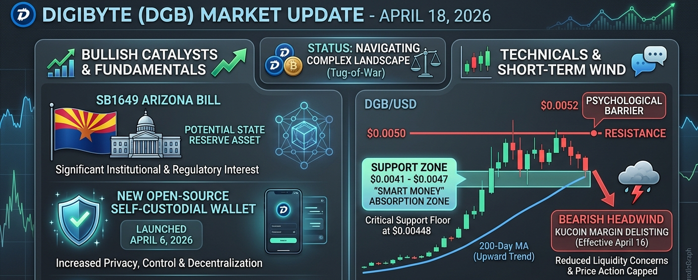As of April 18, 2026, DigiByte $DGB is navigating a complex market landscape characterized by a tug-of-war between institutional recognition and exchange-driven volatility. On the bullish side, $DGB has gained significant narrative momentum following the advancement of Arizona’s SB1649 bill, which explicitly names DigiByte as a potential state strategic reserve asset. This regulatory nod, combined with the April 6 launch of a new open-source self-custodial wallet and ongoing progress on the "DigiDollar" stablecoin, has bolstered long-term community confidence. Technically, $DGB is showing resilience, currently trading around $0.0047 with "Smart Money" reportedly absorbing supply near the critical $0.0041–$0.0047 support zone.