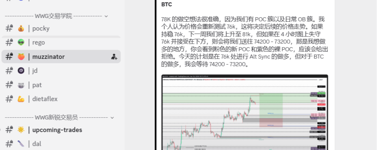 作为成熟的分析师,muzzinator 从不预测行情,只做对策。他提出,如果 76k 失守并转化为阻力,市场将迎来对 74,200 - 73,200 区间的暴力回测。那里分布着粉色的新 POC 和紫色的裸 POC,是多头最理想的“再次上车点”。