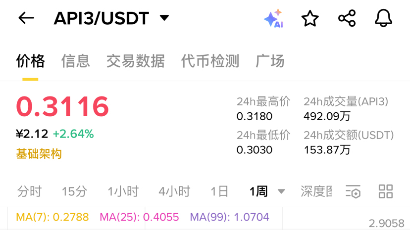 过去12小时,API3从0.3036拉到0.3152,涨了3.8%。单看这点涨幅不算啥,但量能跟上了——小时成交量多次突破20万USDT,峰值冲到近49万USDT。EMA(7)也稳稳站在EMA(25)和EMA(99)上面,短期多头结构算是搭起来了。