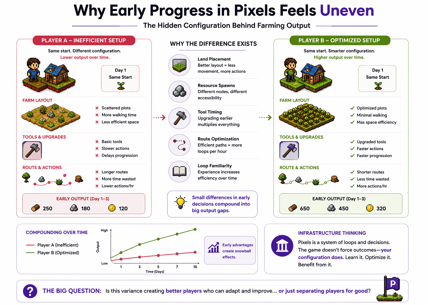 When a game lets small choices create big outcomes, you get natural variance. In something like Pixels, where the actions repeat and build on each other, those minor differences don’t go away. They snowball.