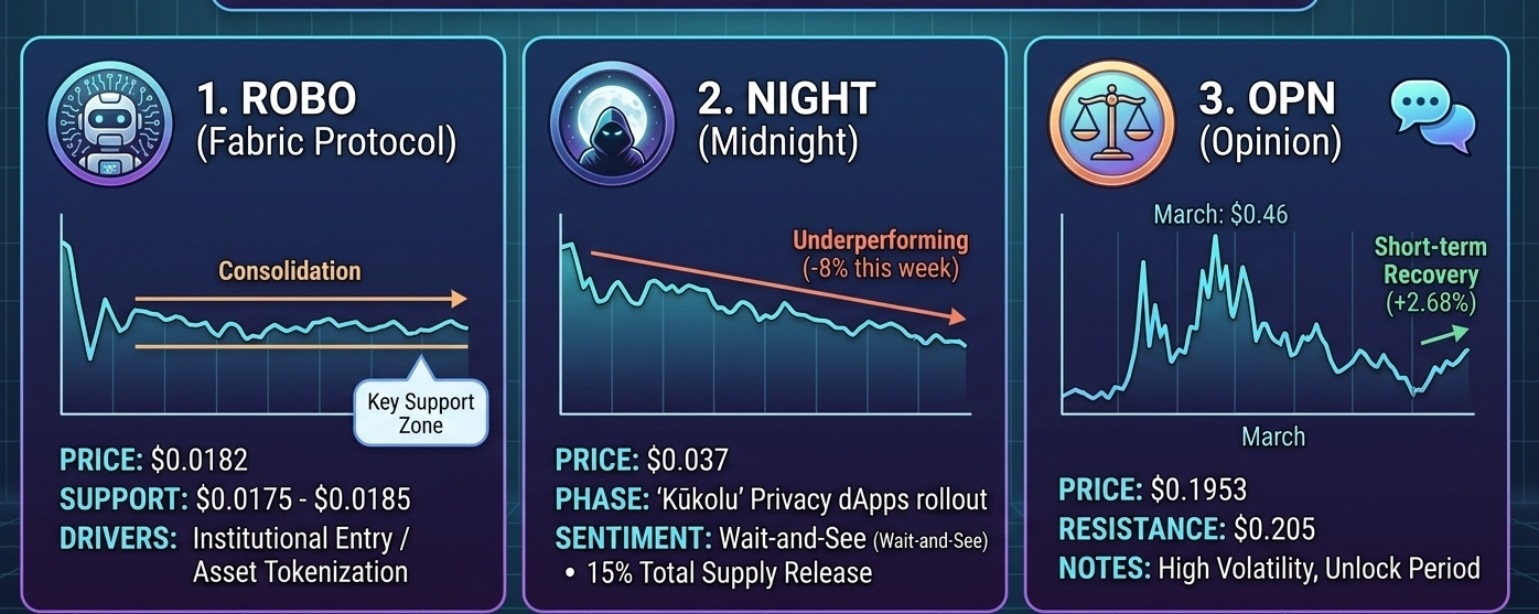 The cryptocurrency market is currently navigating a period of "Defensive Recovery," with Bitcoin testing resistance levels around $77,000. While the broader sentiment remains cautious, several mid-cap and niche tokens like ROBO, NIGHT, and OPN are showing distinct technical patterns.
