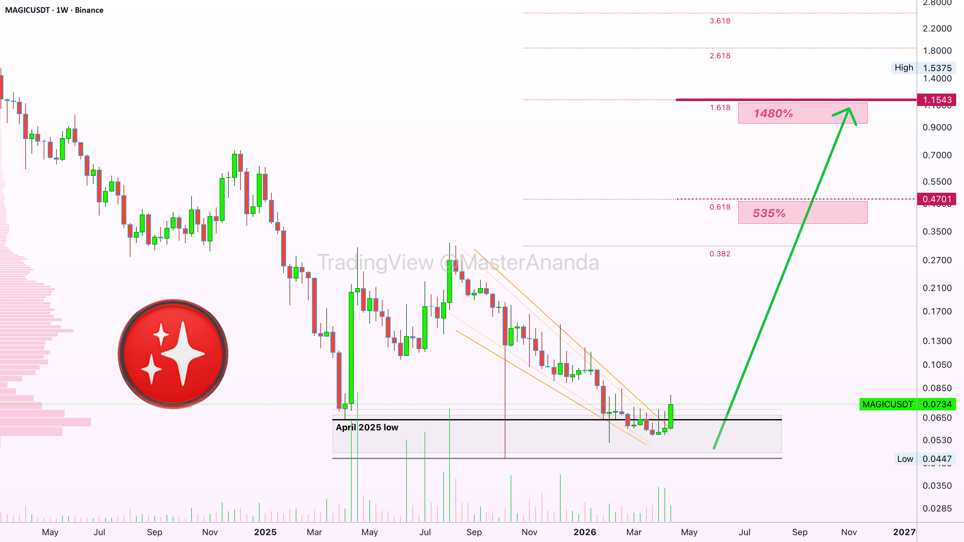 بمجرد أن كسر MAGIC فوق هذا الخط، تصبح الإمكانية الصعودية للرسم البياني فعلية وأول هدف لنا كمنطقة مقاومة نشطة التالية. هذا يعني أن الآن 535% عند حوالي $0.47 يجب أن يكون هدفًا سهلاً. هذا مُؤكد بالفعل.