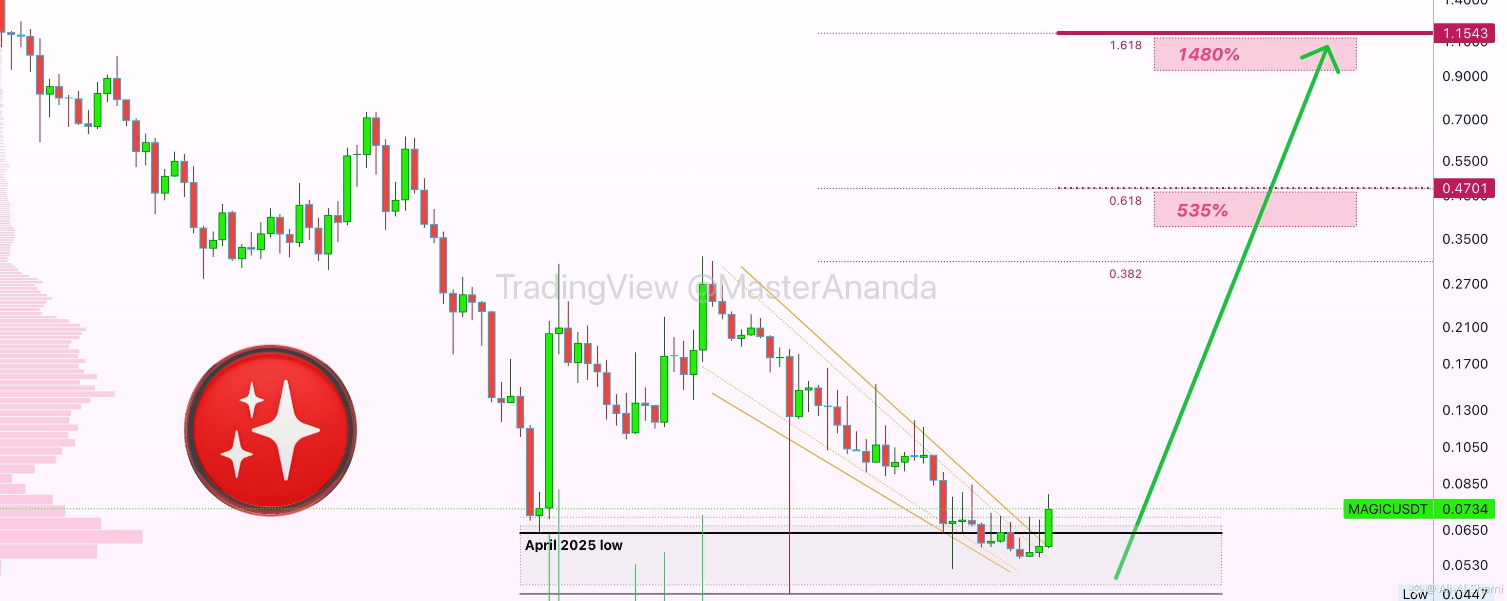 الفاصل الرئيسي بين الظروف الهابطة والإمكانية الصعودية المنشطة يأتي كأدنى مستوى في أبريل 2025، أذكر هذا المستوى كثيرًا على البيتكوين. هنا، على MAGICUSDT، يظهر كخط أسود.