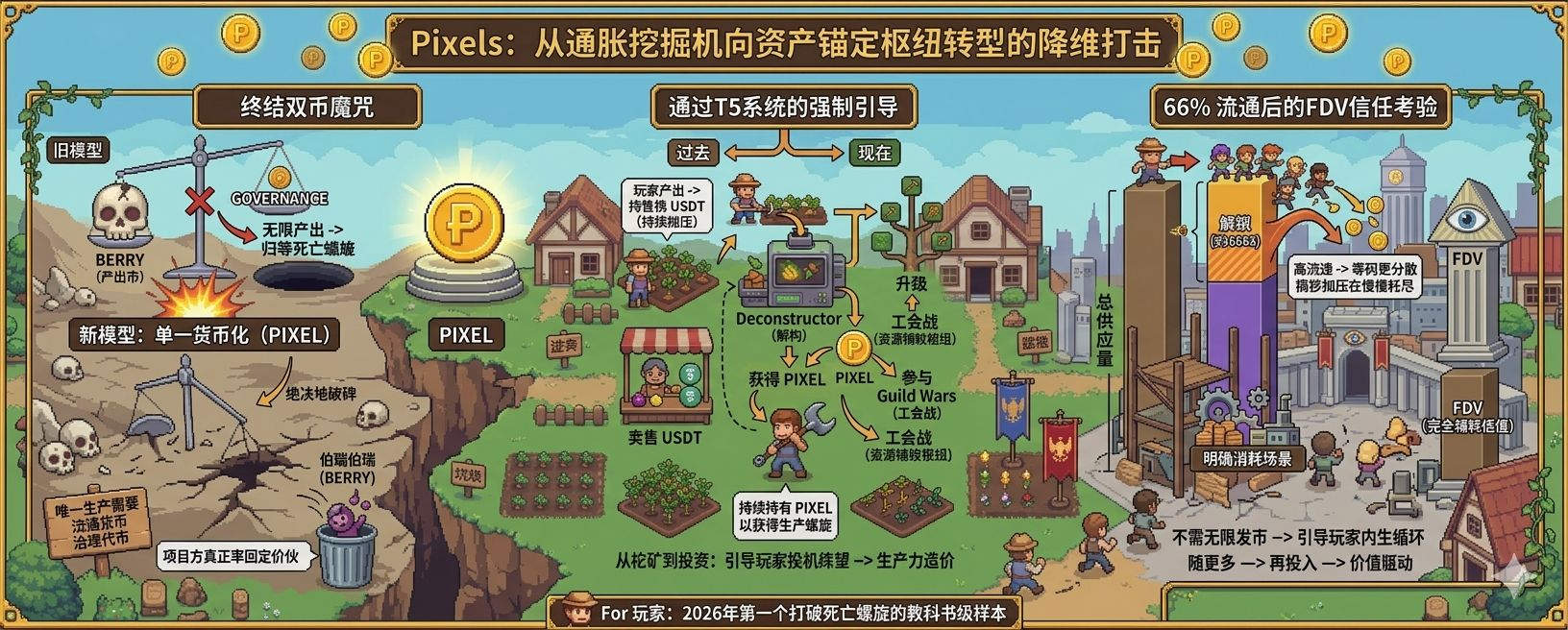 Pixels 这一轮自救的核心,在于决绝地砍掉了 BERRY,强制 PIXEL 实现单一货币化。这不是简单的代币合并,而是彻底断绝了低成本产出-抛售的循环。PIXEL 成为游戏内唯一的生产要素,即是流通货币也是治理代币,项目方真正拿回了定价权。