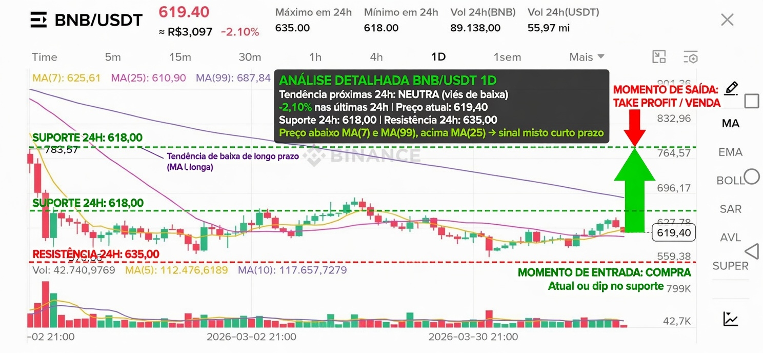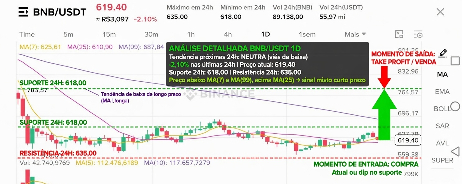 - Preço atual: 619,40 USDT (-2,10% em 24h).