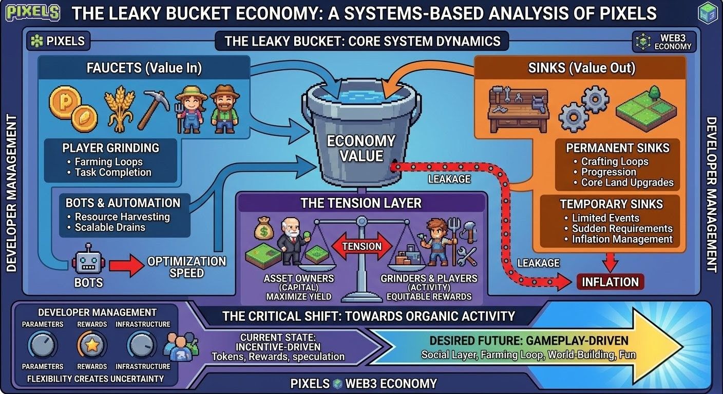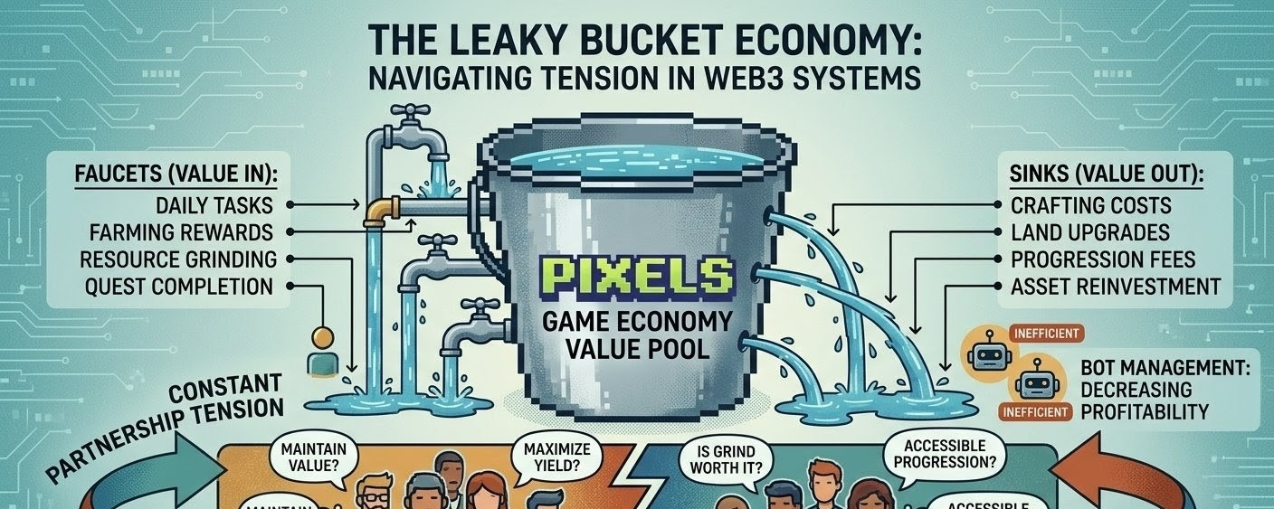 If you actually want to understand something like Pixels, you’ve gotta zoom out a bit and think in systems. I always come back to this one idea it’s basically a bucket with holes. Value comes in through faucets, leaks out through sinks, and the whole game is just… trying not to empty the thing.