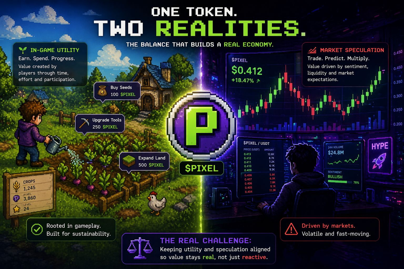 Pixels sits right at that crossroads. It isn’t just a game but it’s not just a token either. It’s both, stacked on top of each other. The gameplay side gives PIXEL a reason to exist you spend, earn and interact because you’re doing things inside the world. The market side brings in speculation, liquidity, hype people chasing the next wave. They are both necessary but they run on completely different clocks.