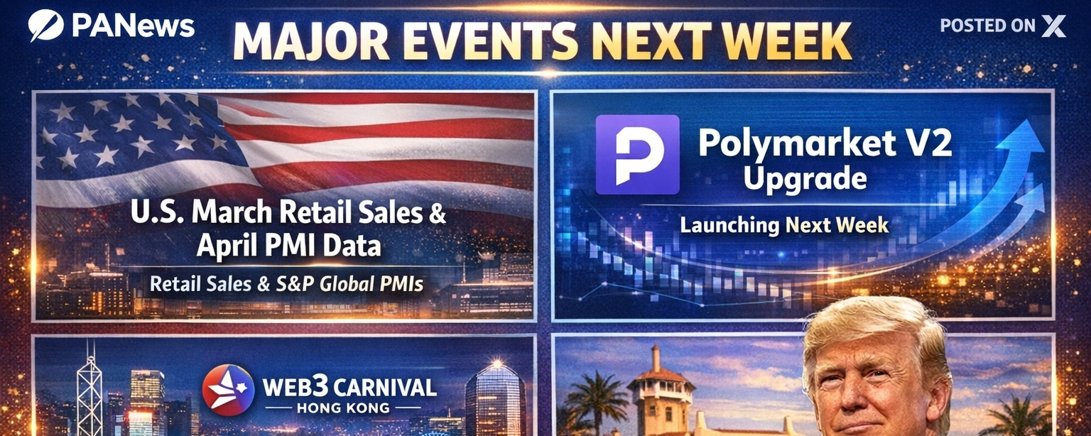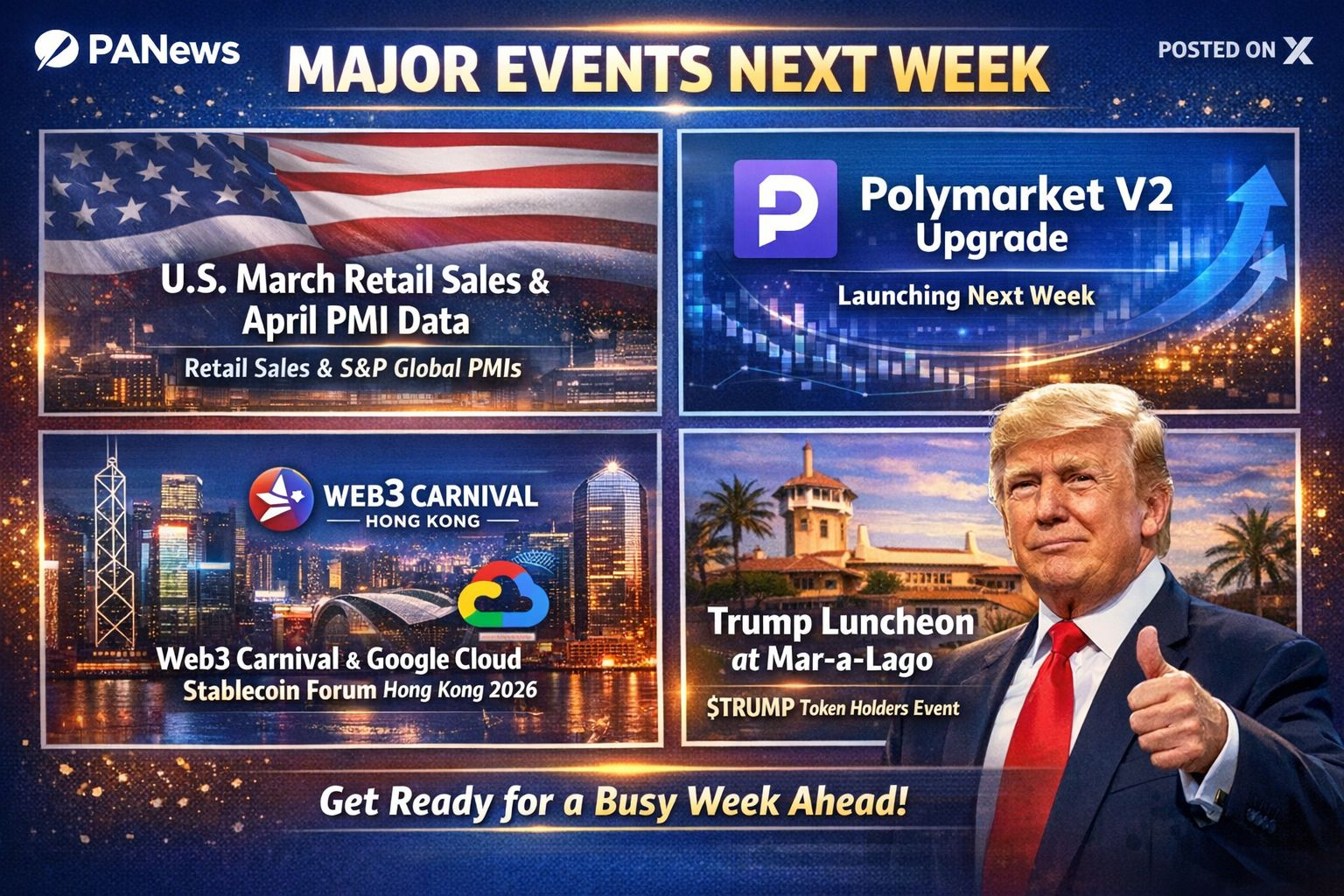 PANews posted on X (formerly Twitter) that several significant events are set to take place next week. The United States will release the March retail sales monthly rate and the preliminary April S&P Global Manufacturing and Services PMI. Additionally, the Polymarket V2 exchange upgrade is scheduled to go live. In Hong Kong, the Web3 Carnival and the Google Cloud Stablecoin Forum Hong Kong 2026 will also occur. U.S. President Donald Trump is expected to host a luncheon for $TRUMP token holders at Mar-a-Lago.