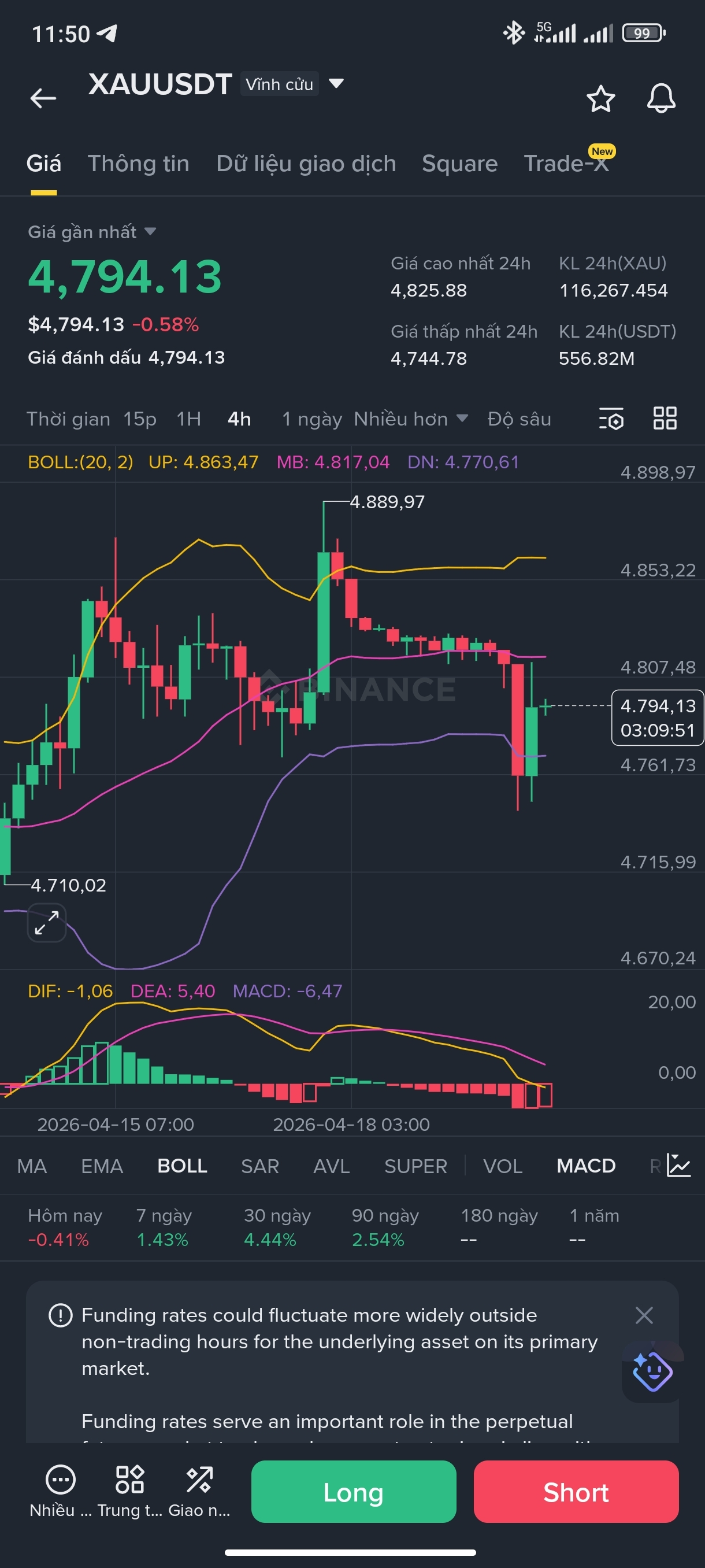 Nhìn chart XAUUSDT 4H: giá quanh $4,800, nằm trên EMA89 ($4,748), RSI 51 neutral — còn room chạy. MACD hơi bearish crossover nhẹ nhưng vẫn trong vùng dương. Gold đang hướng tuần thứ 4 tăng liên tiếp, bất chấp Hormuz drama.