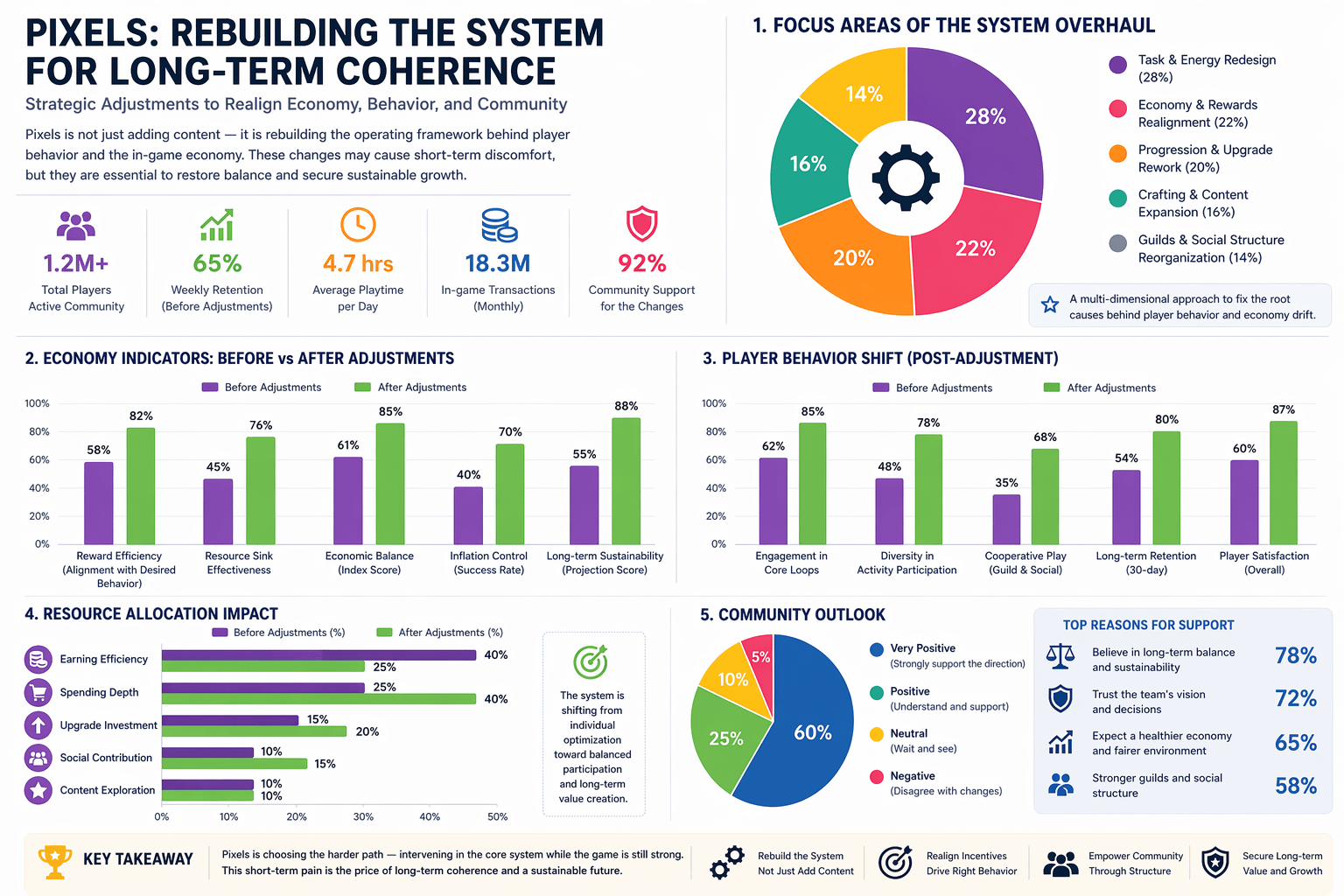 Truly ironic, that short term discomfort is exactly the signal that the team still holds decision making power over the product. If a project only keeps catering to community inertia, it will gradually be led by the groups that optimize the best rather than by the design goal itself. In Pixels, I read a very clear choice, they are willing to remove some old advantages in order to stop the economy from being bent by loops that are too easy to exploit. This is not the kind of adjustment made to look good on the surface, it is an adjustment made to reclaim the right to define value inside the game.