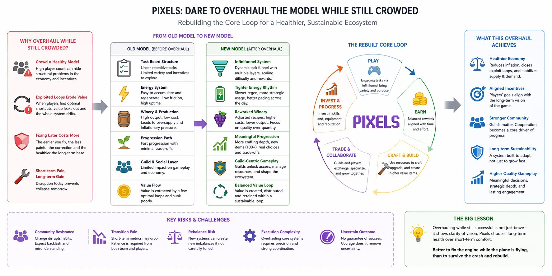 I think this is the most research worthy point about this project. A product that still manages to keep people coming back regularly is very easily seduced by the feeling of stability. When tasks are still being done and the community has not left yet, the safest choice is always to keep everything as it is. But Pixels touched exactly the part that most projects avoid, which is the structure that creates behavior inside the game.
