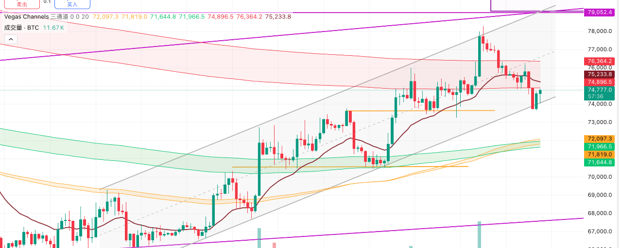 底线:73500。只要不出现放量实体阴线有效跌破此位,上升趋势完整无损。