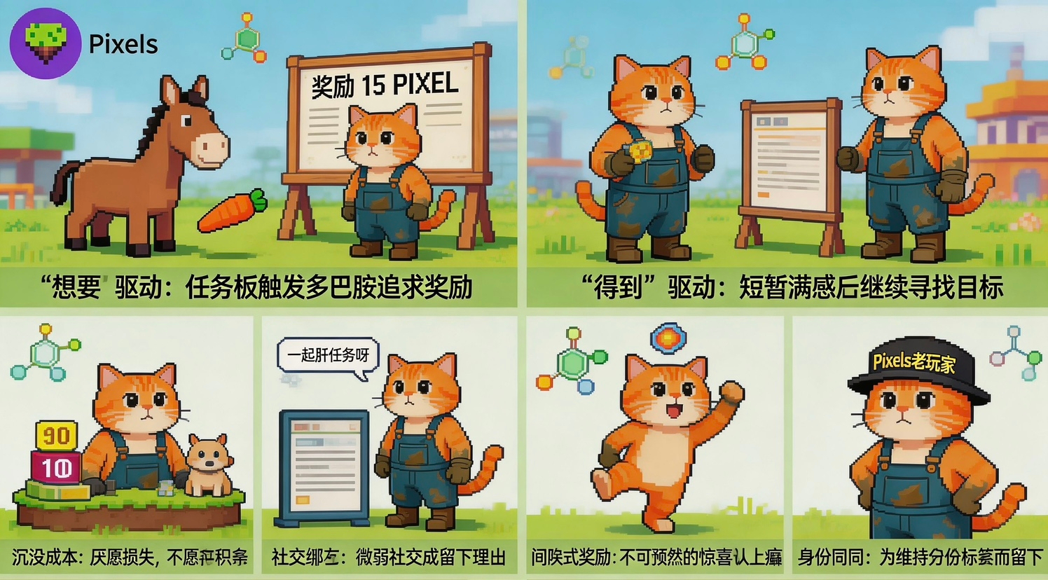 第一种是“想要”。当你看到一个潜在的奖励时,多巴胺飙升,驱动你去追求。Pixels 的任务板就是典型的“想要”触发器——那个任务框里写着“奖励 15 PIXEL”,你心里就开始盘算:再砍十棵树就够了,再浇五次水就行了。你被“想要”驱动着重复劳动,像一头追着胡萝卜跑的驴🥕。