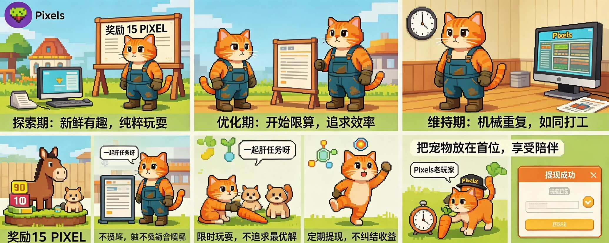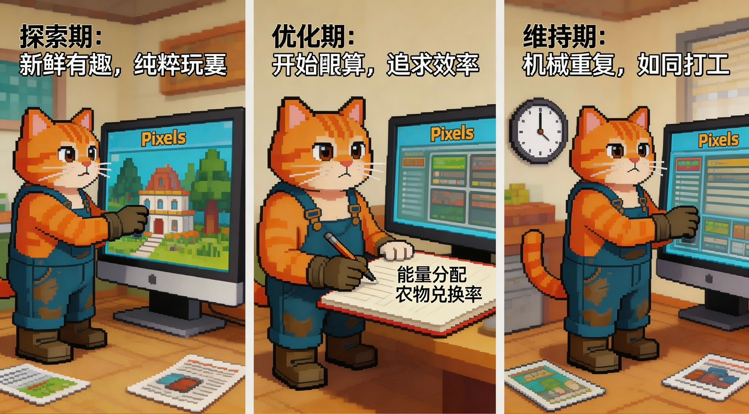 我观察过自己在 Pixels 里的行为变化,分成三个阶段。