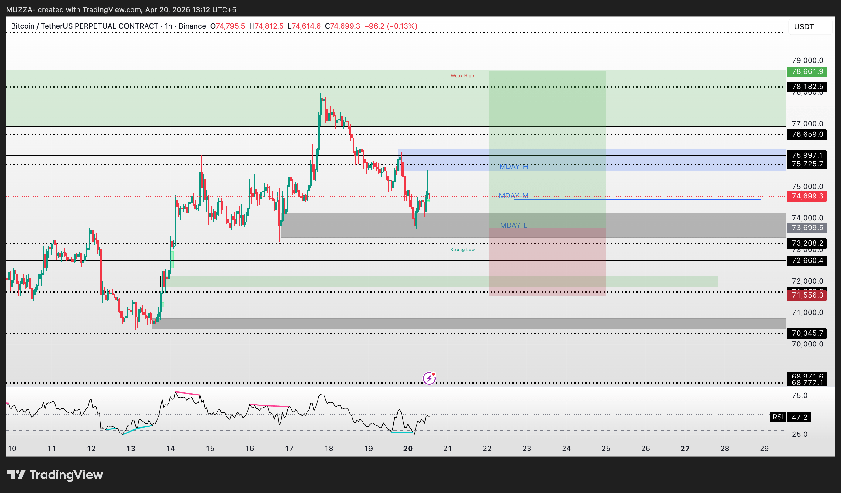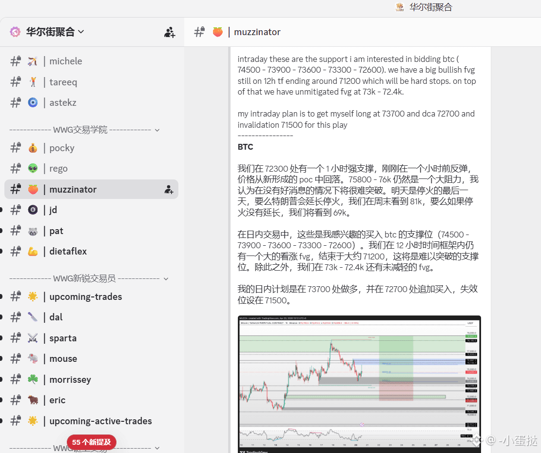 muzzinator 明确将第一入场位设在 73,700,并同步制定了在 72,700 处的 DCA(平均成本法)补仓计划。这种布局的深度在于他捕捉到了 12 小时线级别中未被填补的 FVG(公允价值缺口)。他强调,多头的“死守线”就在 71,500,一旦跌破,所有多头计划立即宣告失效。