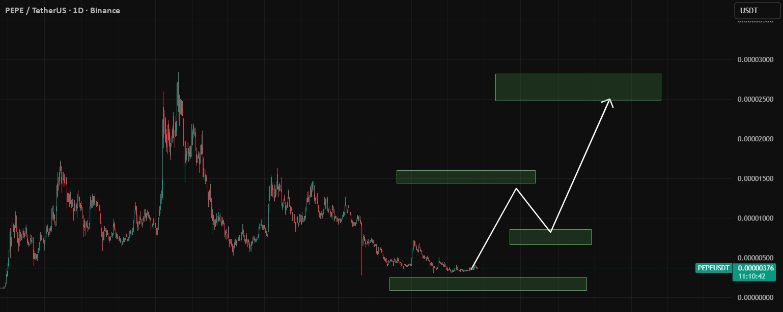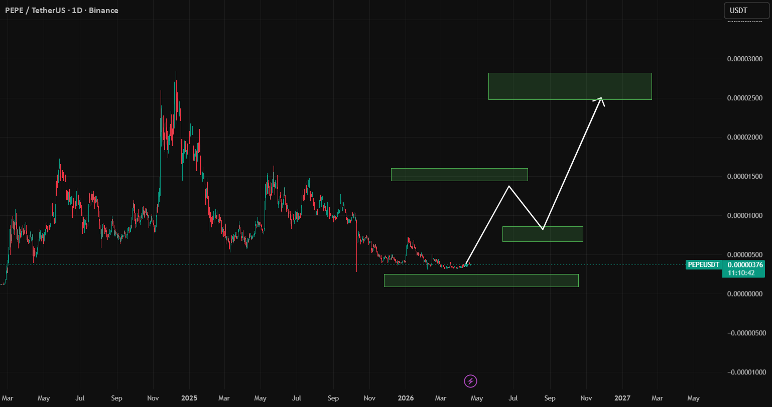 PEPE PEPEUSDT يتداول عند 0.00000376 دولار أمريكي، بزيادة 3.01% على مدار اليوم. تُظهر مخطط 1D هيكل تراكم واضح بعد دورة هبوط طويلة من قمة أواخر 2024.