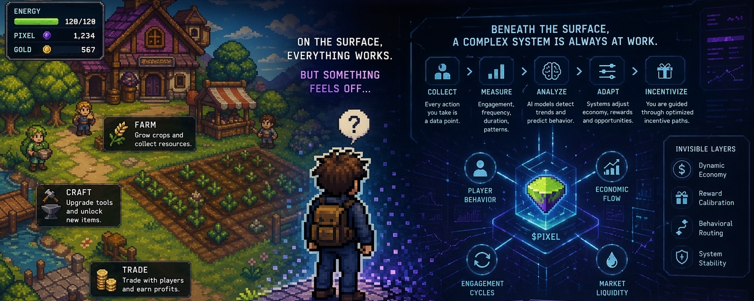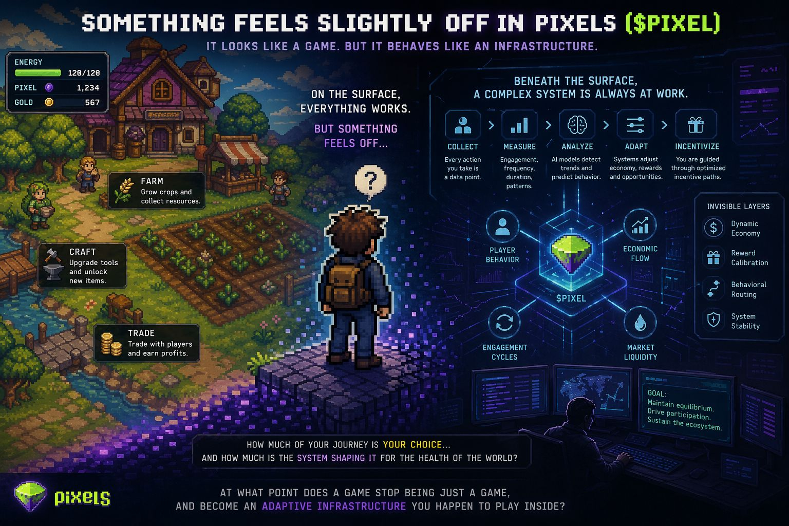 There’s this feeling in $PIXEL that just doesn’t sit right, even though you can’t put your finger on why. You jump in, go through your usual routine farm, collect, upgrade, trade a bit and honestly, everything seems fine. The animations don’t glitch, rewards still show up, the economy keeps rolling along. Nothing looks broken. But if you hang around a little longer, something heavy starts to creep in. The whole thing feels less like a world you inhabit and more like a carefully monitored experiment watching how you move inside it.
