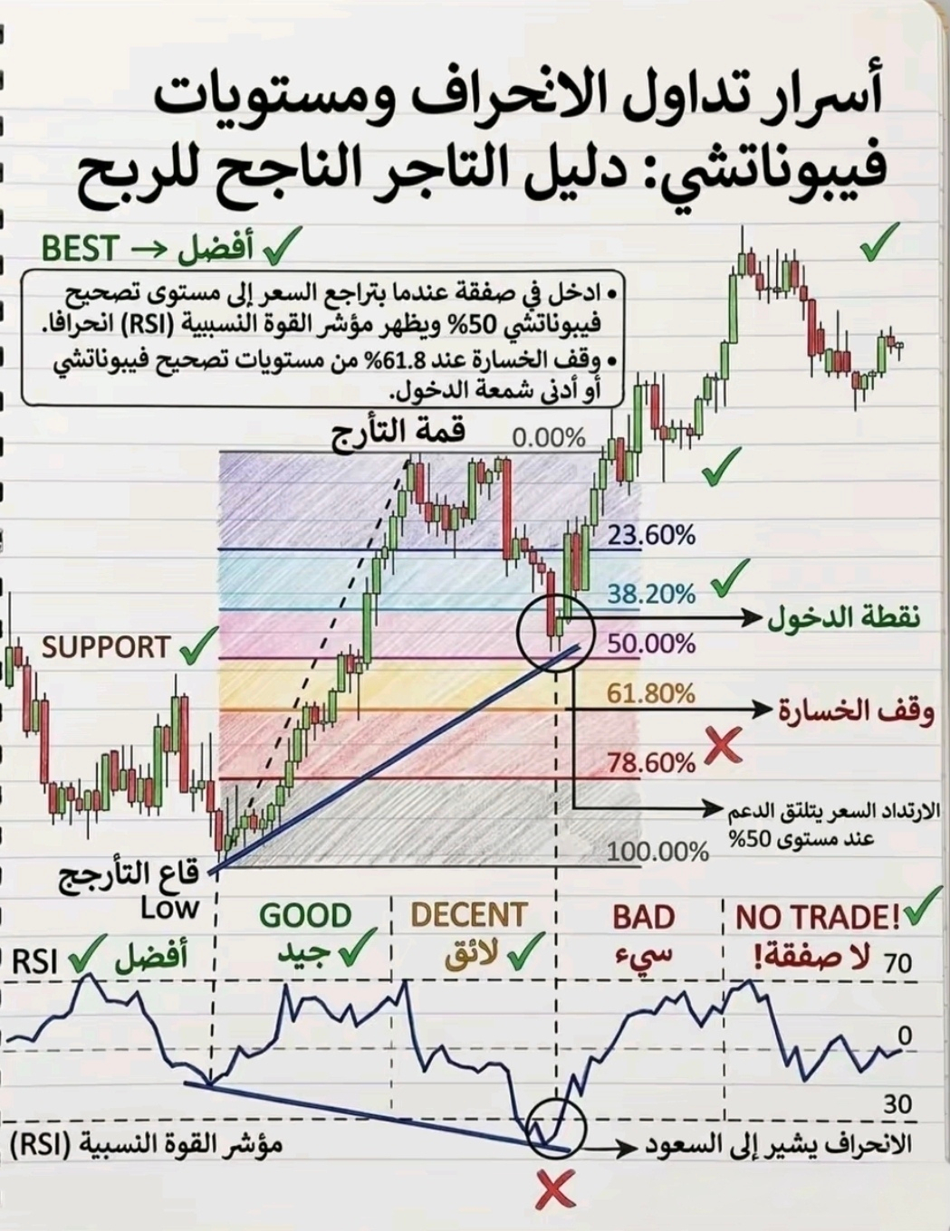 هذه الصورة توضح استراتيجية تداول الارتدادات (Pullback) باستخدام مستويات فيبوناتشي ومؤشر القوة النسبية RSI، وهي من أشهر استراتيجيات التحليل الفني. إليك الشرح التفصيلي: