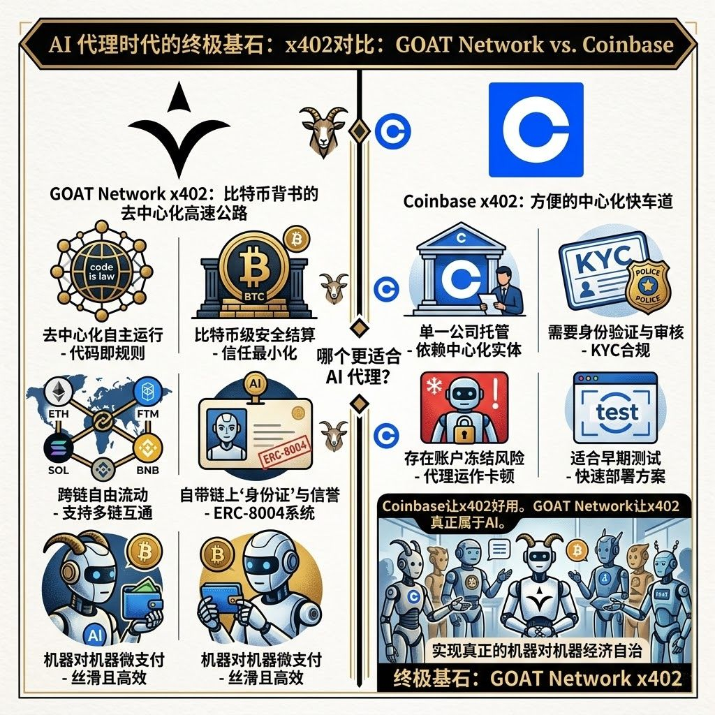 🔹GOAT Network x402:去中心化 + 比特币安全版。同样接口,但支付跨链,支持以太坊、Polygon、Arbitrum、BNB Chain、Solana、GOAT Network 等,最终结算落到比特币安全的链上环境;还自带 ERC-8004 代理身份系统,每个 AI 代理都有链上“身份证”和信誉记录,像人一样有信用分。规则全写在代码里,没人能单方面改或冻结,完全信任最小化。