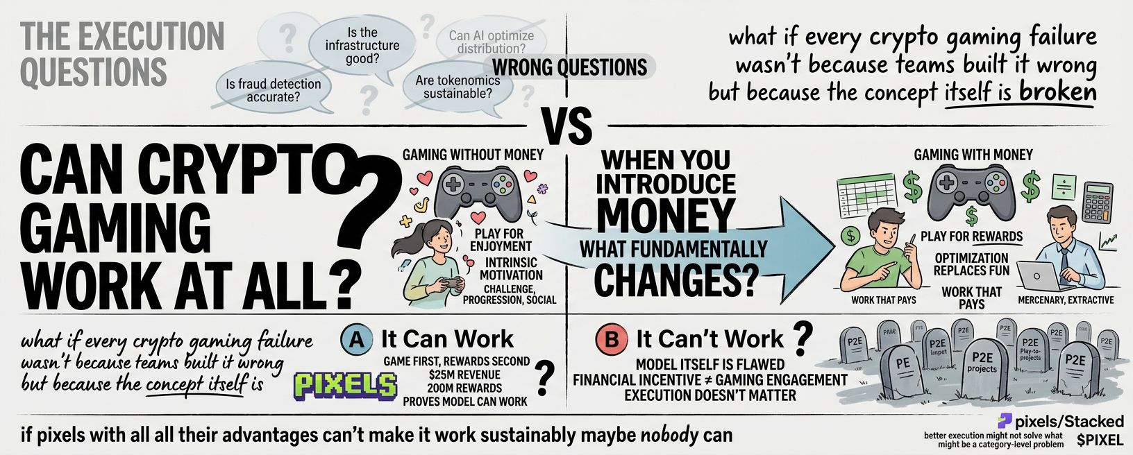 I keep watching @Pixels and trying to figure out if I'm asking the wrong question by focusing on whether Stacked's infrastructure is good enough when the real question might be whether crypto gaming can work at all regardless of infrastructure quality.