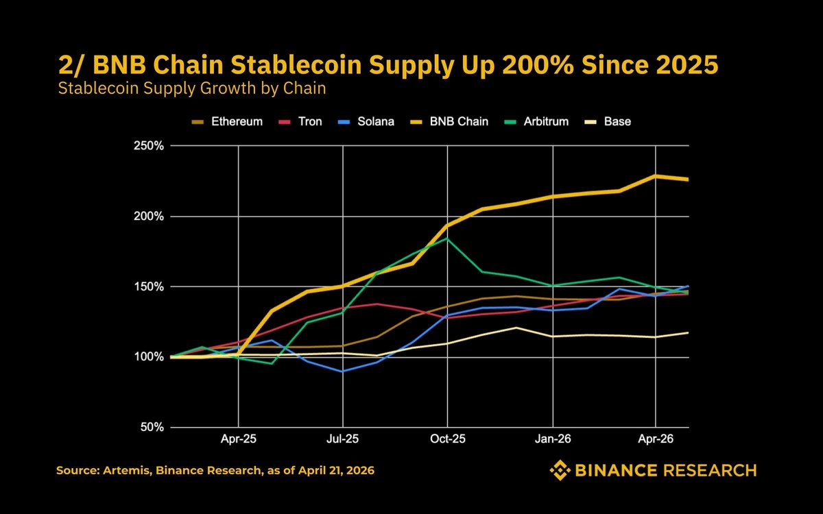 Up over 200% since early 2025, the steepest curve among the majors by a clear margin. Ethereum, Tron, and Solana are clustered together at 140 to 150%. Base is the laggard at 115%. And this isn't a small-base flattery effect. BNB Chain entered 2025 already sitting near the top of the nominal supply rankings. Adding another 200% on top of that baseline is real liquidity migration, not a statistical artifact. Worth asking where that flow is coming from and why now.