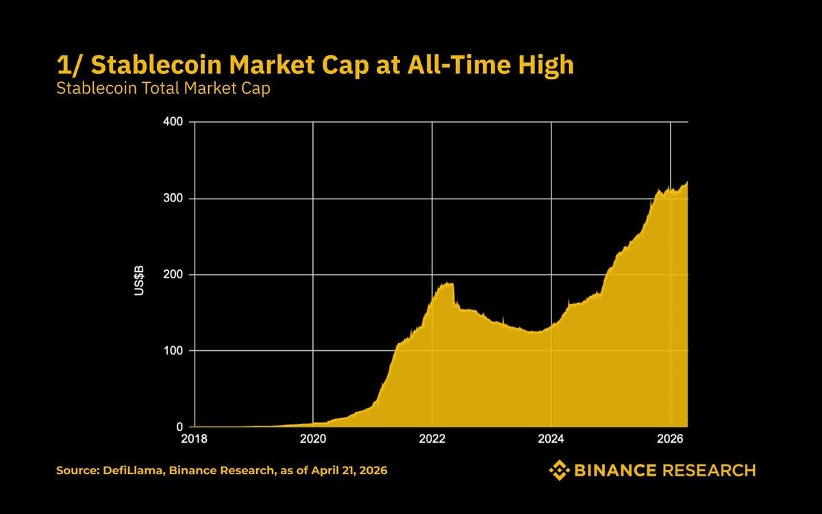 Under $5B in 2020, roughly $185B at the 2022 peak, ~$320B now. The part I keep staring at is that the trend hasn't broken since early 2024. No dramatic V-recovery, just a steady grind higher through drawdowns, rate cycles, and sentiment chop. Supply used to be procyclical, pumping with leverage and contracting when the casino shut down. It's now behaving like actual money. That decoupling from speculation is the most bullish macro setup for crypto infrastructure I've seen in years, and I don't think it's priced in anywhere on the chart.