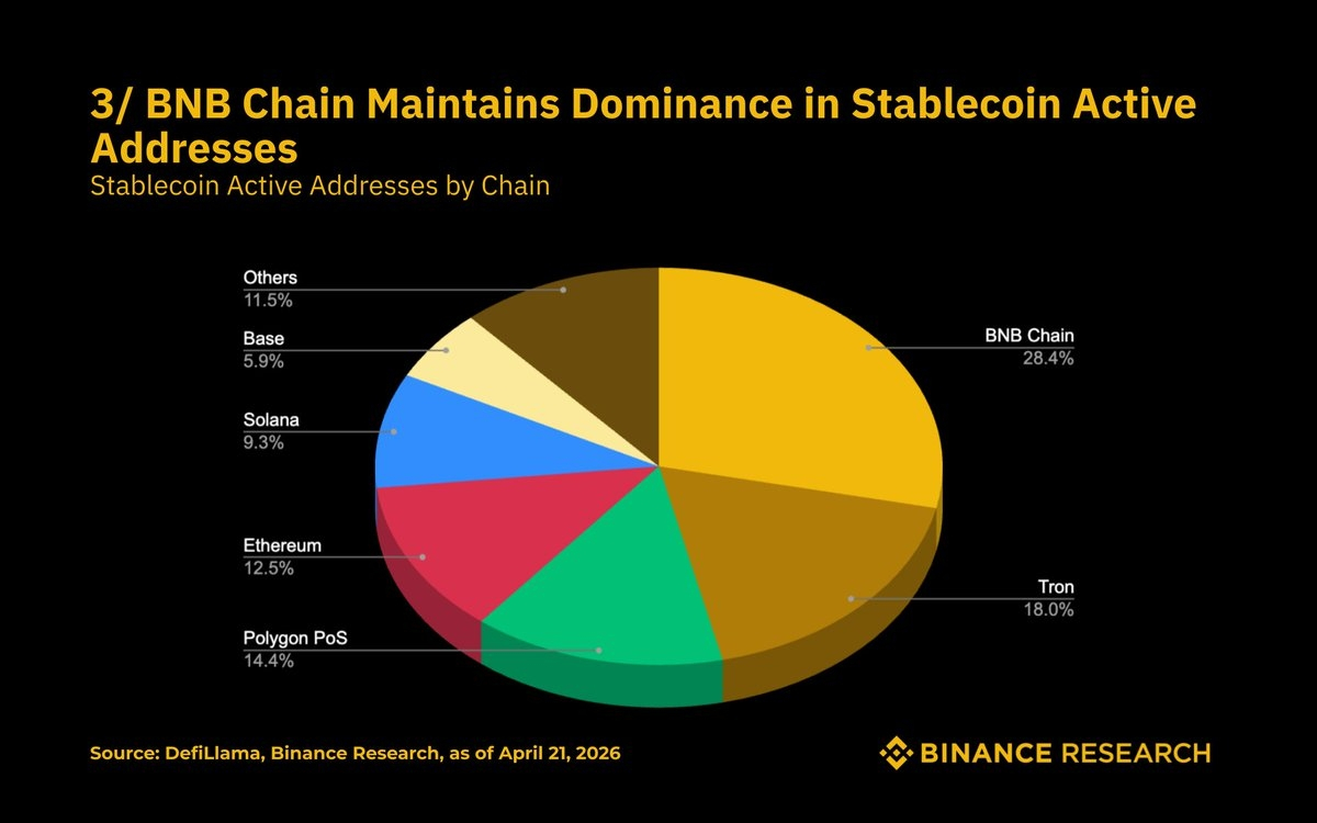 BNB Chain holds 28.4% of stablecoin active addresses. Tron 18%, Polygon 14.4%, Ethereum 12.5%, Solana 9.3%, Base 5.9%. Supply can be gamed by a handful of whales. Address counts can't, or at least not cheaply. The chain with the most users actually moving digital dollars right now isn't Ethereum and isn't Solana. The gap to the next competitor is ten full percentage points. Crypto discourse hasn't caught up to this yet, and when the narrative eventually closes on the data, the repricing tends to happen in a compressed window.