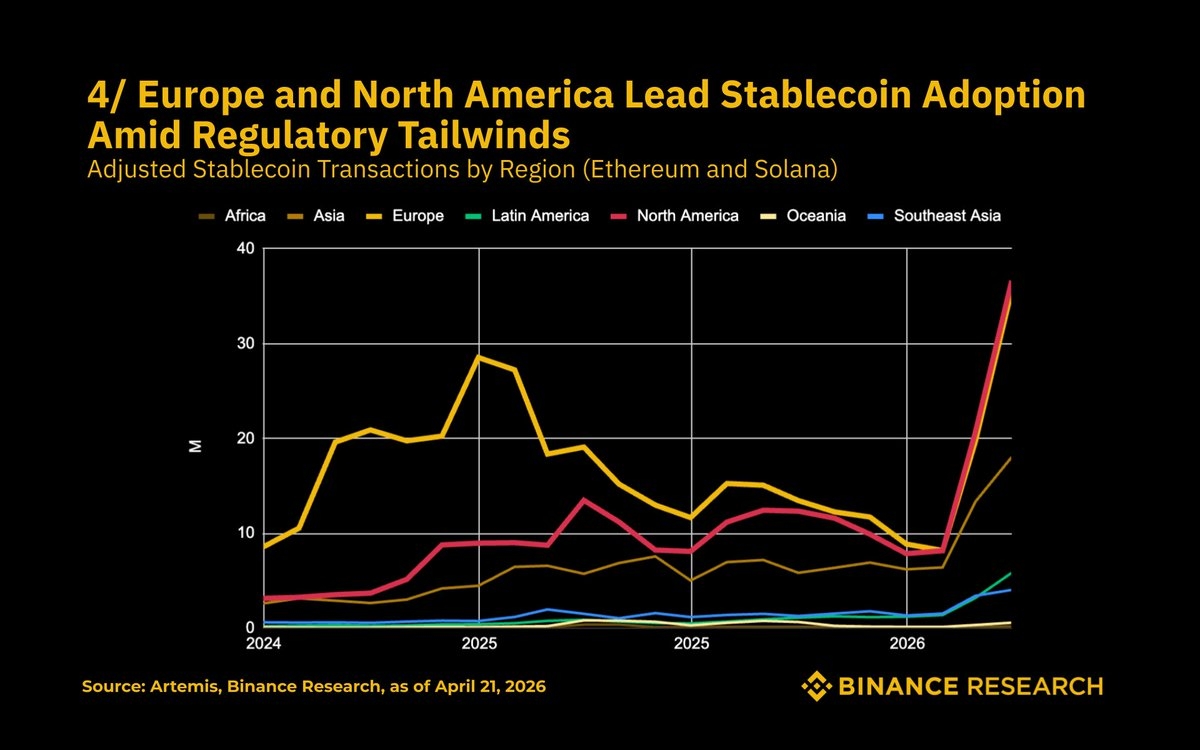 North American adjusted volume on Ethereum and Solana went near vertical in 2026, now running level with Europe after being well behind for years. What this tells me is there are basically two parallel stablecoin markets running at the same time. Emerging-market, retail-heavy, small-ticket flow on BNB Chain, Tron, and Polygon. North American, institutional, large-ticket settlement flow on Ethereum and Solana. Both are compounding, both are eating dollar volume from legacy rails, and they need completely different investment frameworks.