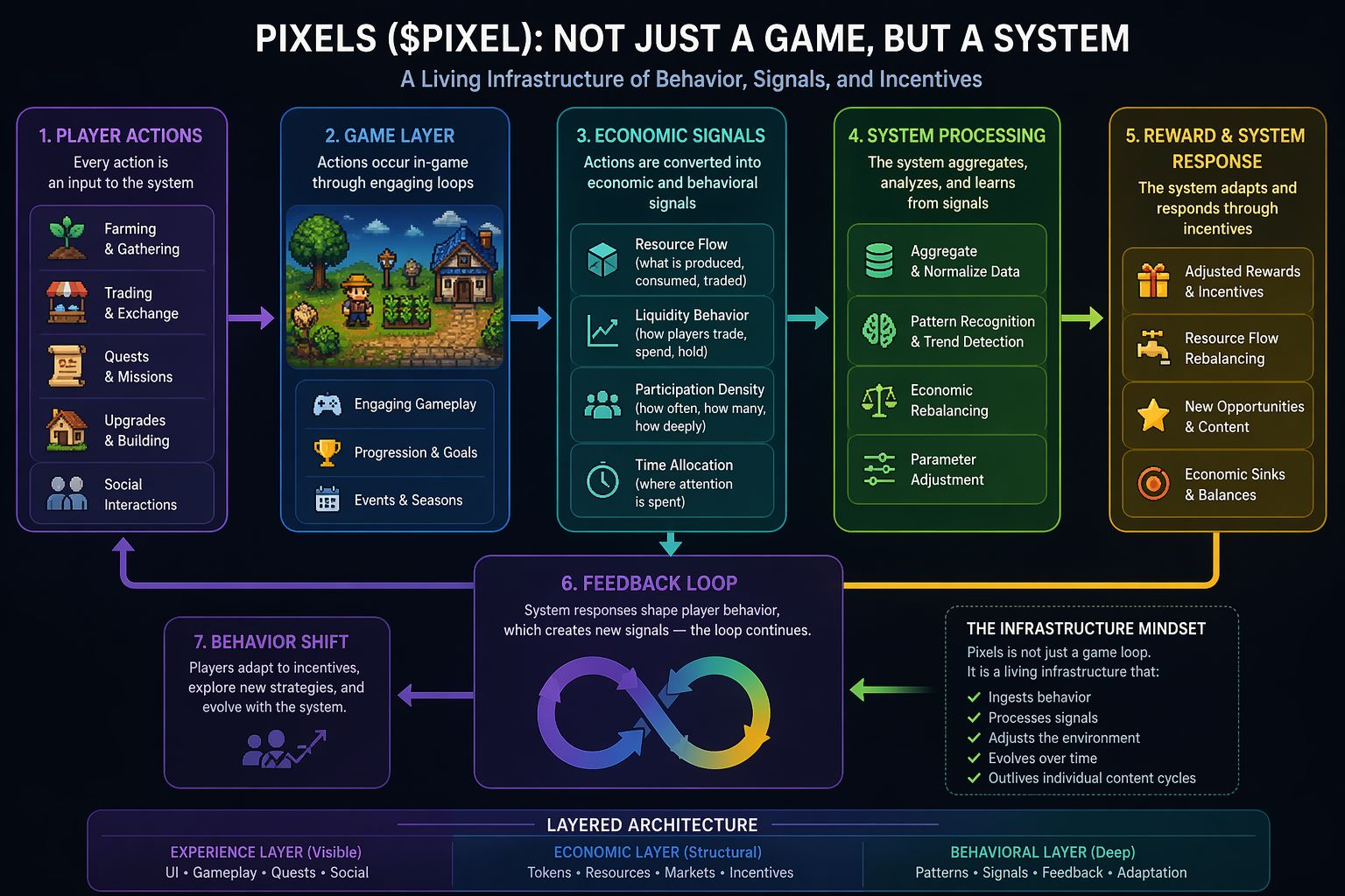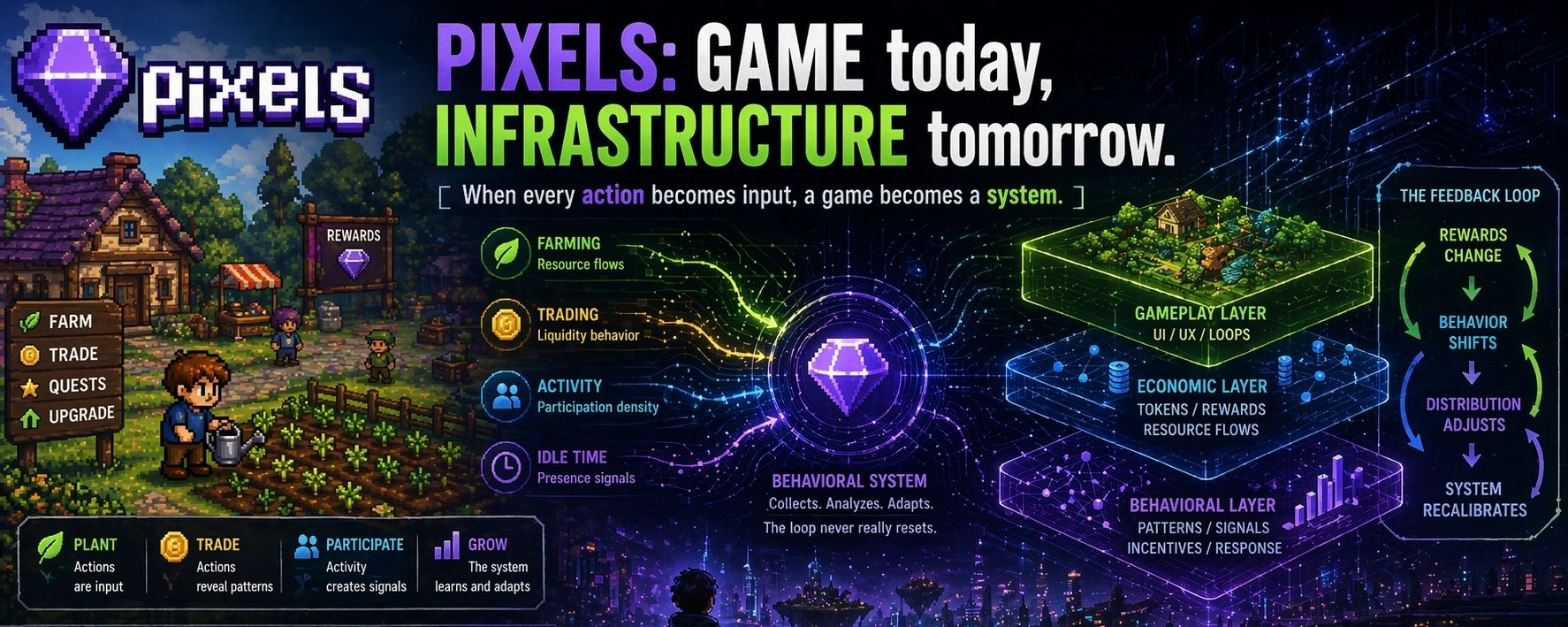 Pixels feels similar it’s not just about the game on top, but the system underneath. The visible layer is gameplay the stuff you interact with. A second layer handles economics tokens, rewards, resource flows. But deeper still, there’s a behavioral layer, tracking how people respond over time.