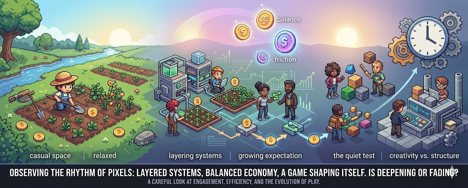 Still, I keep noticing how engagement shifts over time. Not dramatically, but subtly. People come in with curiosity, then settle into routines, and eventually start questioning those routines. That’s where the real test begins. Not in the first interaction, but in the fifth, the tenth, the moment when familiarity replaces novelty. Can Pixels keep that moment from feeling empty? That’s something I’m still watching.