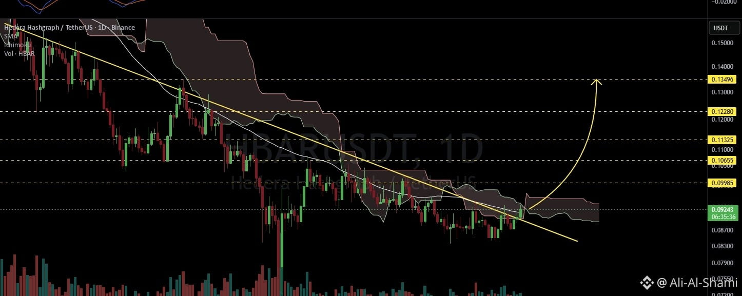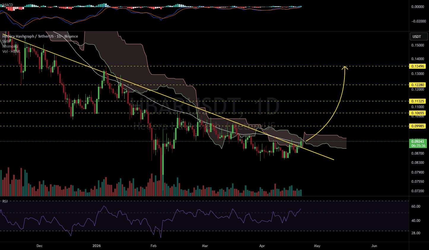 لقد اخترق HBAR المقاومة الهابطة وSMA50 على الشارت اليومي، لكن شمعة اليوم لم تغلق بعد. كما أنه يتحرك حالياً داخل سحابة إيشيموكو. المؤشرات RSI وMACD تشير إلى زخم صعودي محتمل. في حال حدوث اختراق فوق سحابة إيشيموكو، فإن الأهداف الصعودية المحتملة هي: