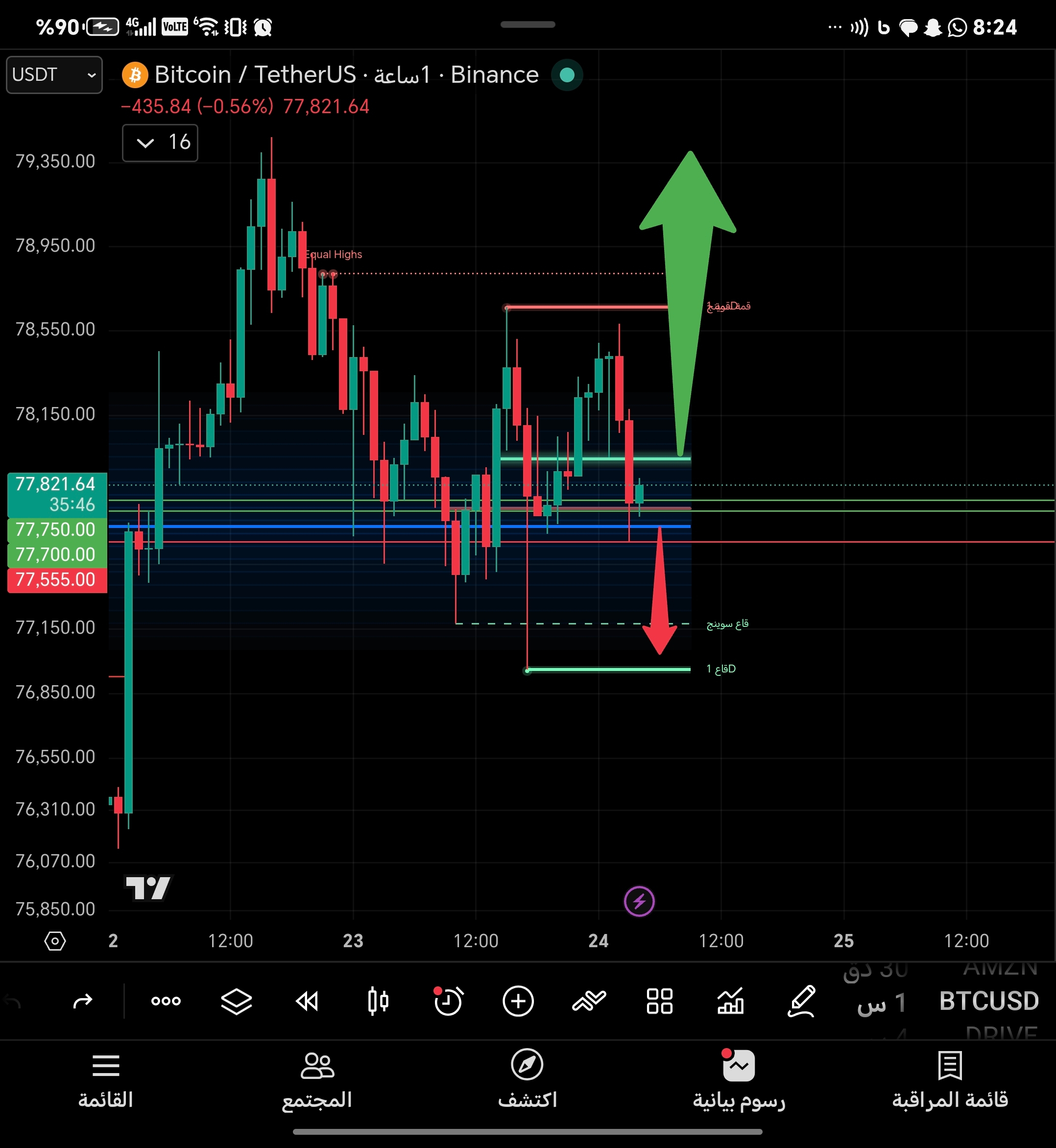 السعر يتداول داخل منطقة الطلب/OB المظللة (77,700–78,000) بعد ارتداد ضعيف من Equal Highs. الشمعة الحمراء الحالية تختبر حد المنطقة السفلي — هذه نقطة اتخاذ قرار.