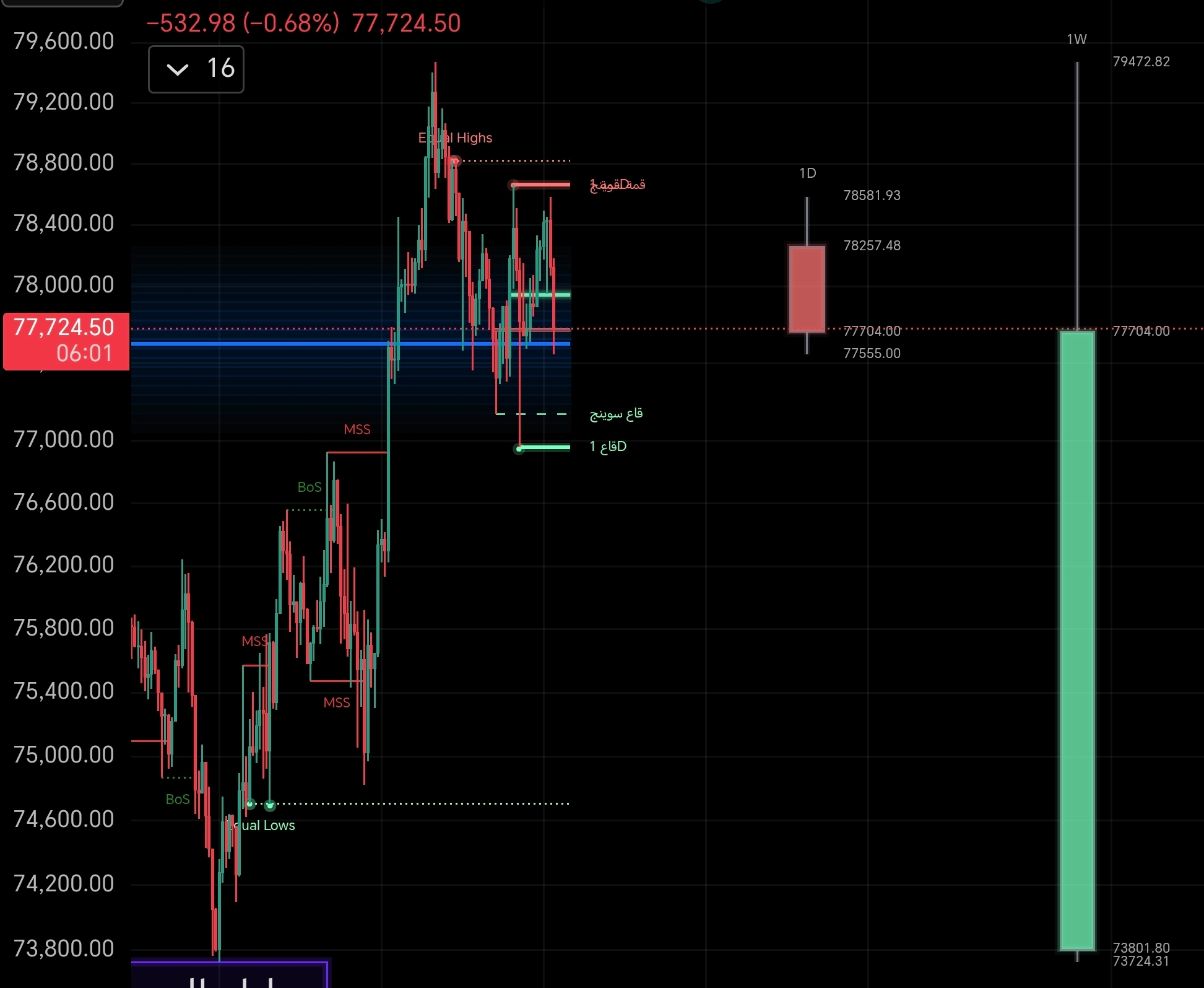 السوق كان في اتجاه صاعد قصير المدى بعد سلسلة BoS من منطقة Equal Lows (74,550). بعد الوصول إلى Equal Highs عند 78,800 ومنها إلى High عند 79,200، حصل رفض قوي وكسر هيكلي داخلي يُشير إلى بداية تصحيح.