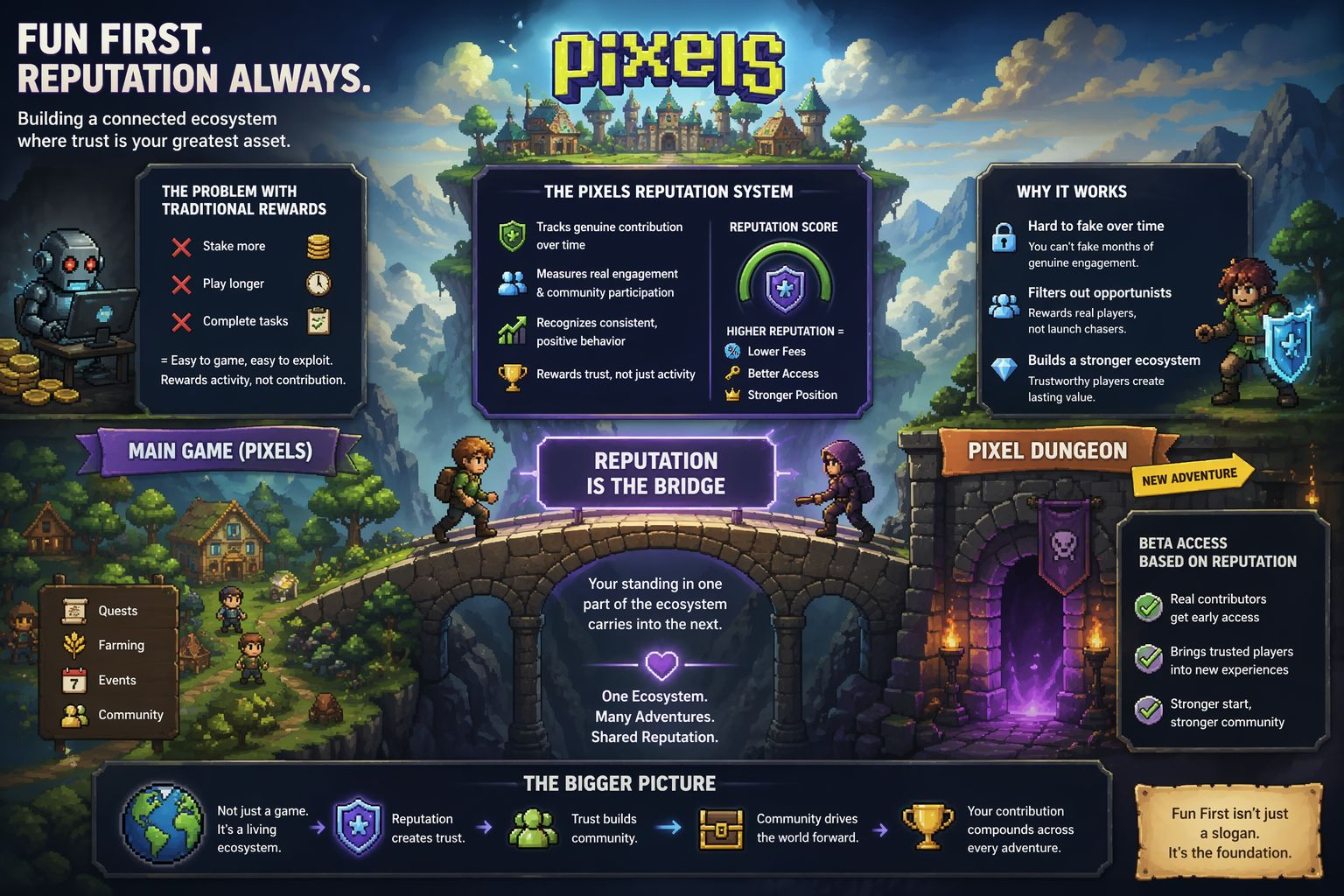 By connecting Pixel Dungeon access to existing reputation, the team turned player history into a cross-game asset. The players who contributed in the main ecosystem gain an advantage in the next one.