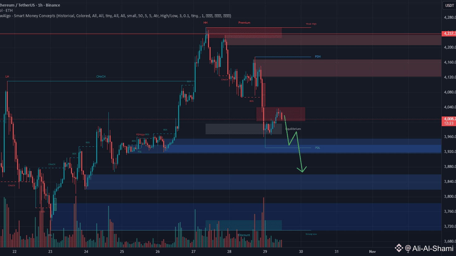 أكدت Ethereum للتو كسر الهيكل (BOS) بعد فشلها في الثبات فوق كلا المتوسطين المتحركين. هذه الرفض — مع هزة سيولة بالقرب من 4230 — تشير إلى احتمال استمرار الاتجاه نحو الأسفل.