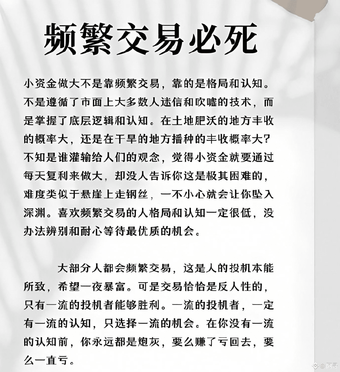 以上都是我炒币10余年实践经验和技术的总结,不一定适用每个人,需要每个人结合自己的实践去使用总结,作为交易者,最可怕的不是你技术上存在问题,而是你的认知不够,掉进了这些交易陷阱却不自知!没有无敌的交易系统,只有无敌地使用交易系统的人!这是真理,交易系统最终要回归到人身上!