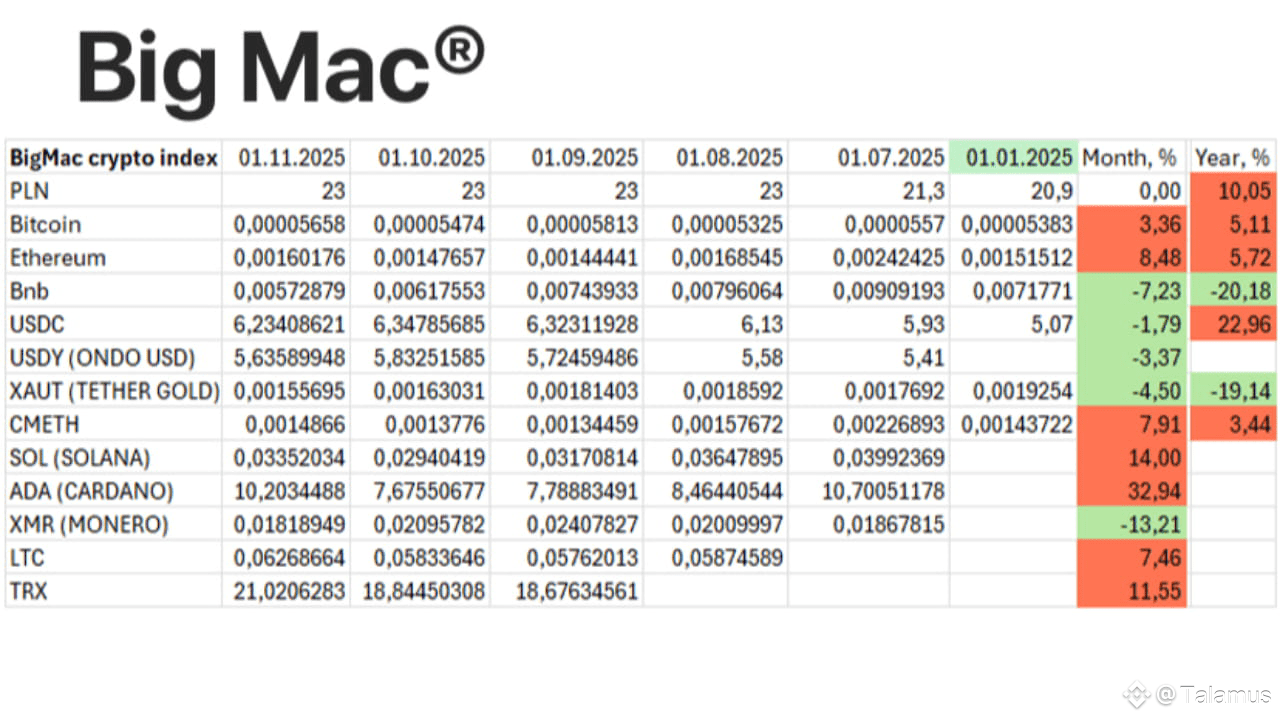 Осенний Big Mac Crypto Index показывает, что в 2025 году криптовалюты продолжают вести себя разнонаправленно.