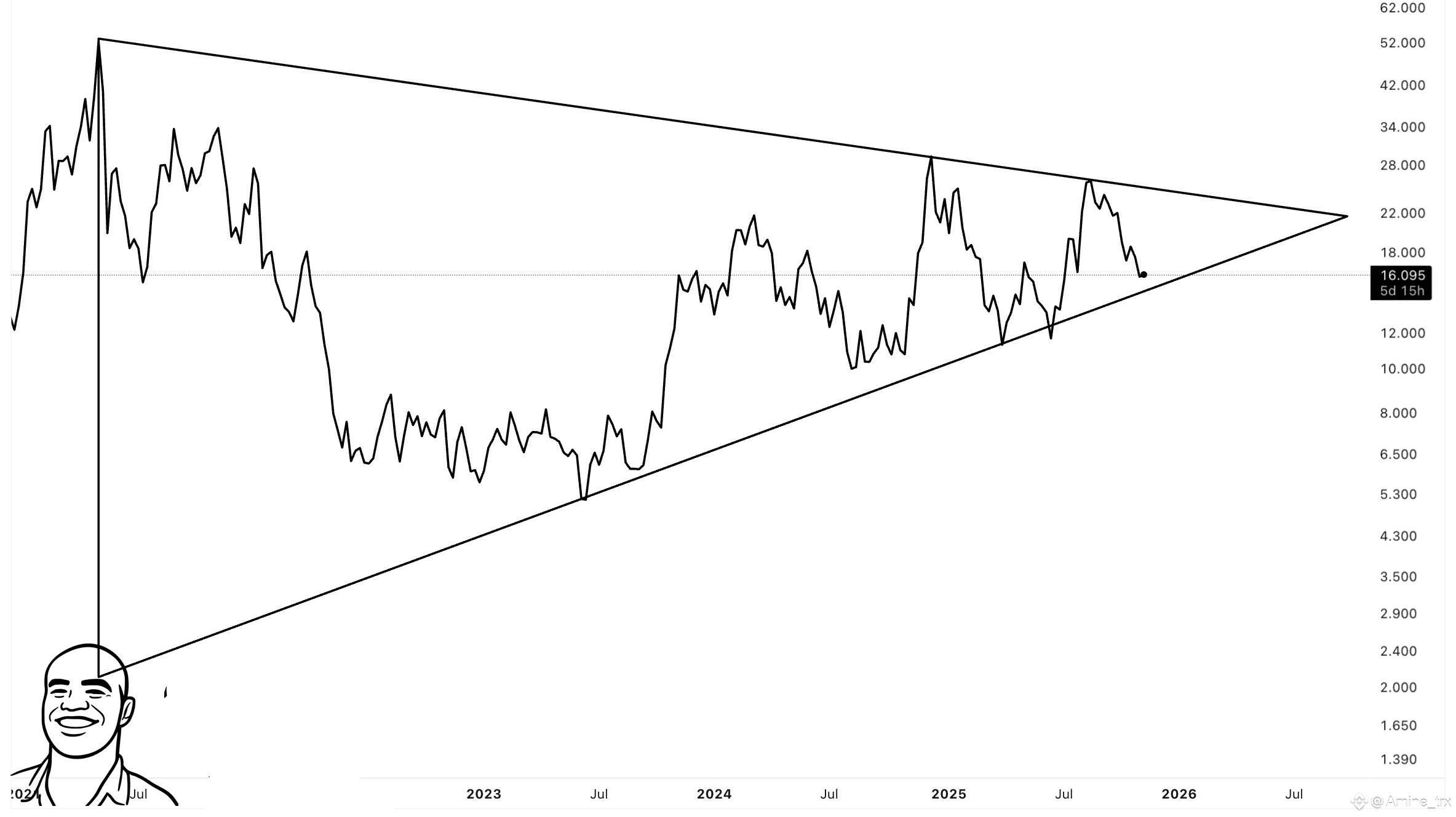 📊 من منظور فني، يُظهر الرسم الأسبوعي أن العملة مرّت بمسارٍ هبوطي طويل منذ قمّتها في عام 2021، تخلّلته قمم وقيعان متراجعة. لكن مع مطلع عام 2025، بدأ هذا الاتجاه يضعف تدريجيًا، حيث استقر السعر داخل نطاقٍ ضيّق بين 0.0001368 BTC و 0.000250 BTC — وهي منطقة تُعرف عادة بمرحلة “الهدوء قبل الانفجار” 💥