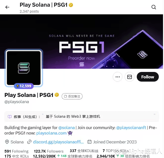 项目简介:Play Solana 是构建在 Solana 上的 Web3 游戏生态,核心产品为掌上游戏机 PSG1。