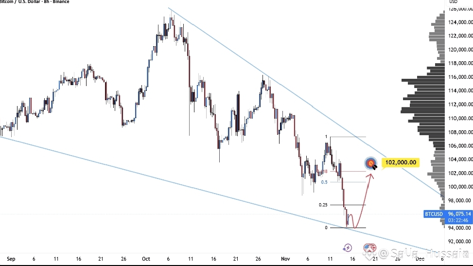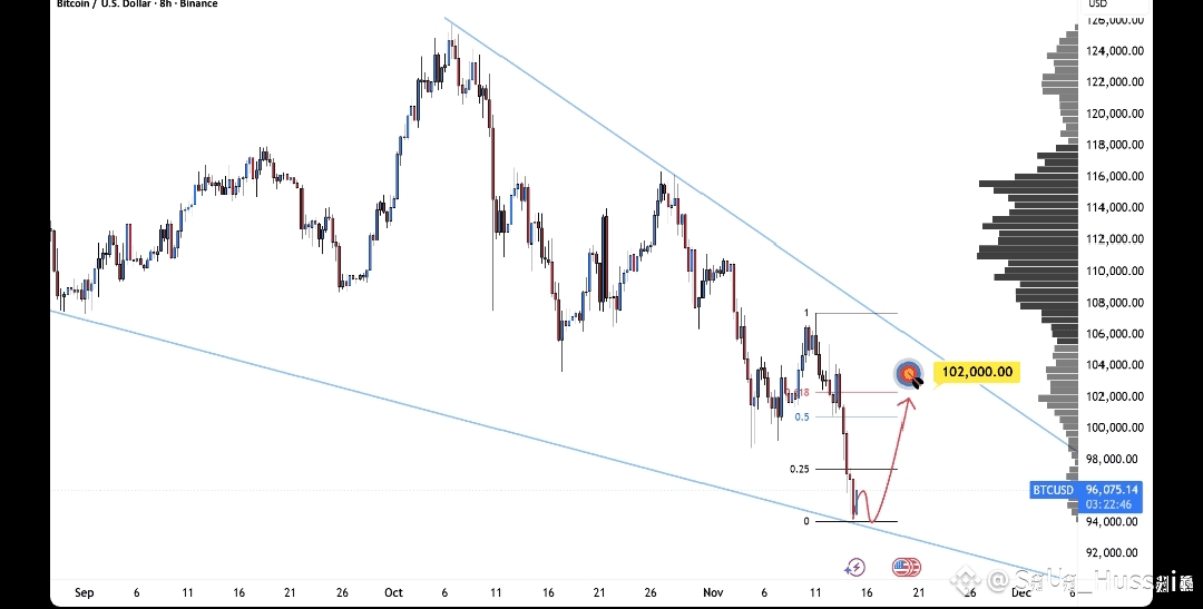 BTCUSD is currently trading inside a well-defined falling wedge, and the price is pressing against the lower boundary of the pattern. This level could serve as dynamic support, and if a strong rejection occurs, we may see a corrective move toward the 102,000 resistance area.